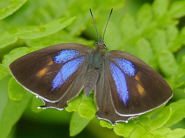 平成26年7月17日(木)。♂。九重町。下と同じ個体。前翅の外縁の黒帯はエゾミドリシジミよりわずかに広い。