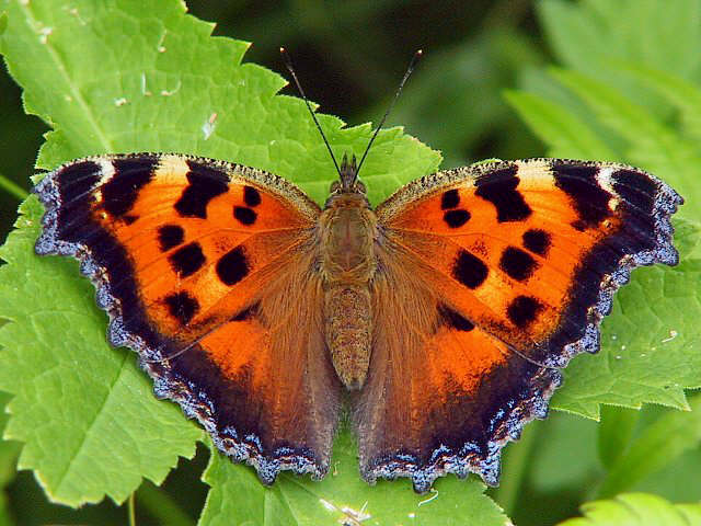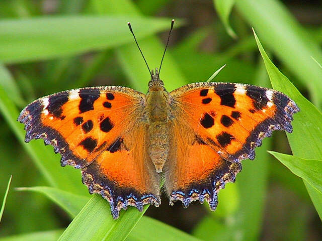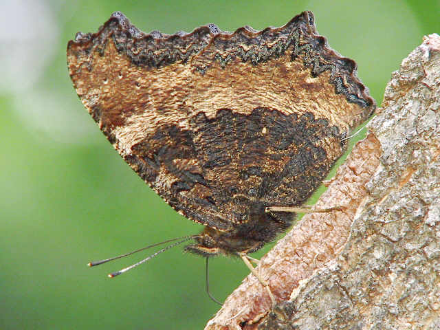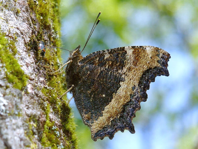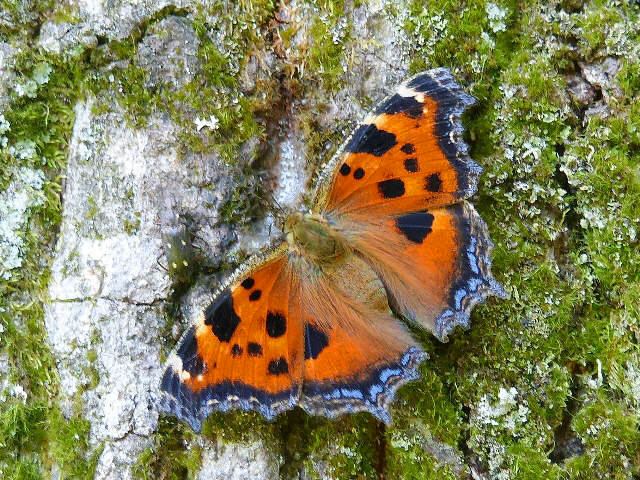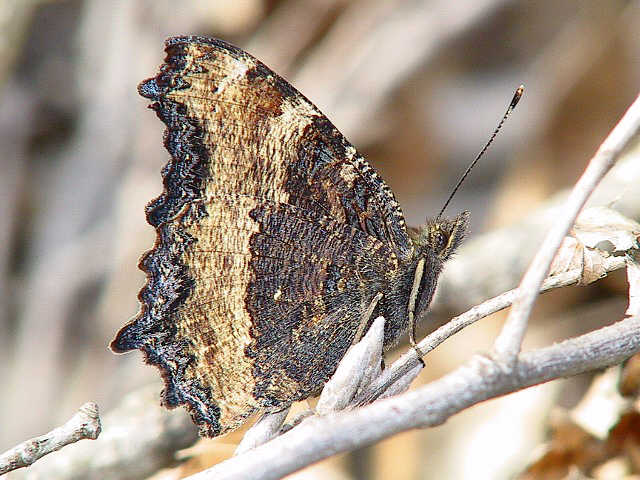 。大分郡野津原町。朝はまだ早く、薄曇りで時々日が差します。翅を広げたヒオドシチョウも本当に綺麗です。