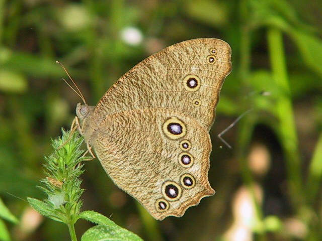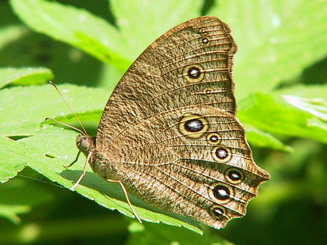 棲息場所はクロコノマチョウと同様の場所ですが、明るいところを好みます。写真を撮るため後を追ったりしましたが、暗い藪の中に逃げ込んだりはしません。飛び方はクロコノマチョウと少し似ていていますが、大きく飛んでゆくことはありません。近くで見ないとクロコノマチョウと区別が難しい所がありますが、クロコノマチョウよりやや小さく、わかりやすい違いは、いくつものはっきりした大きな目玉模様と翅のさざ波模様です。ですから近くで見れば、ウスイロコノマチョウ(夏型)をクロコノマチョウの夏型や秋型と見誤ることはありません。
