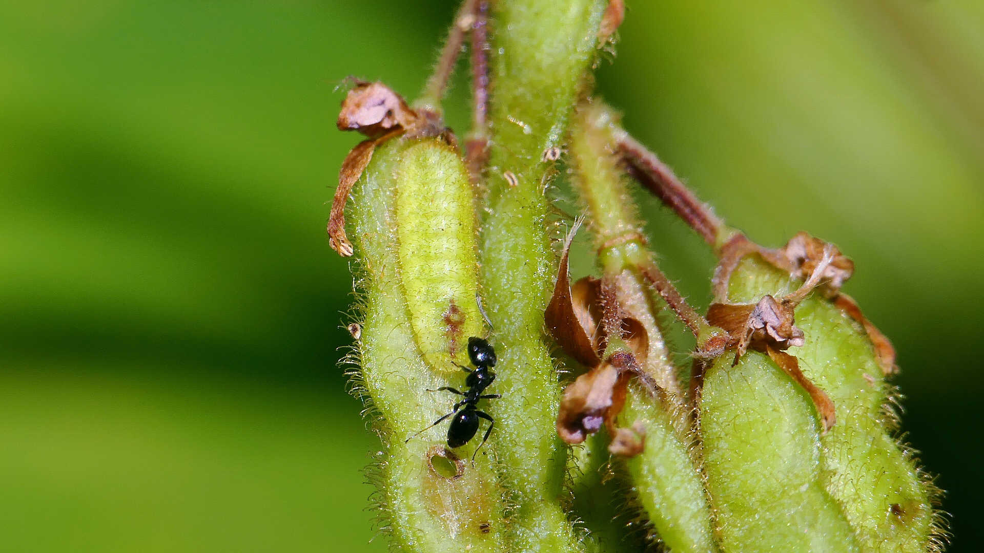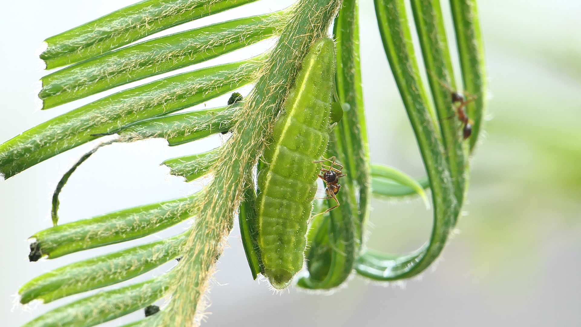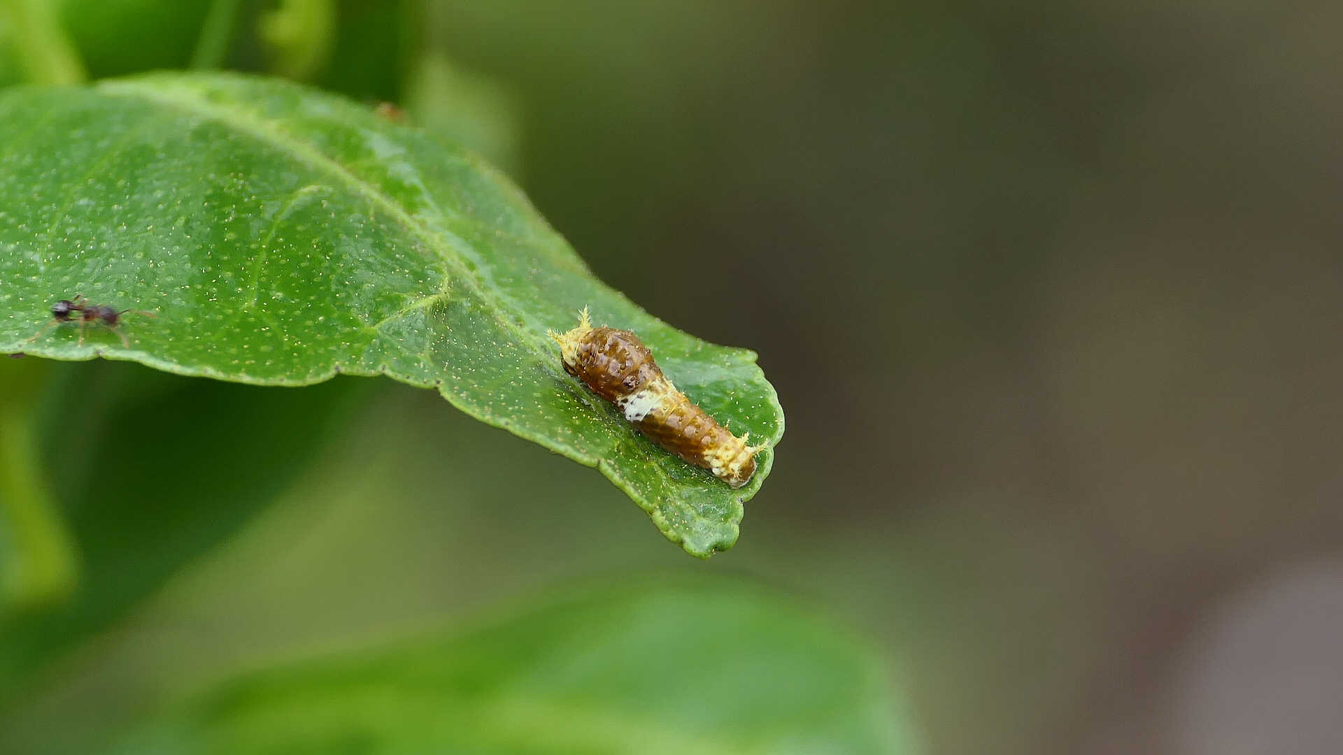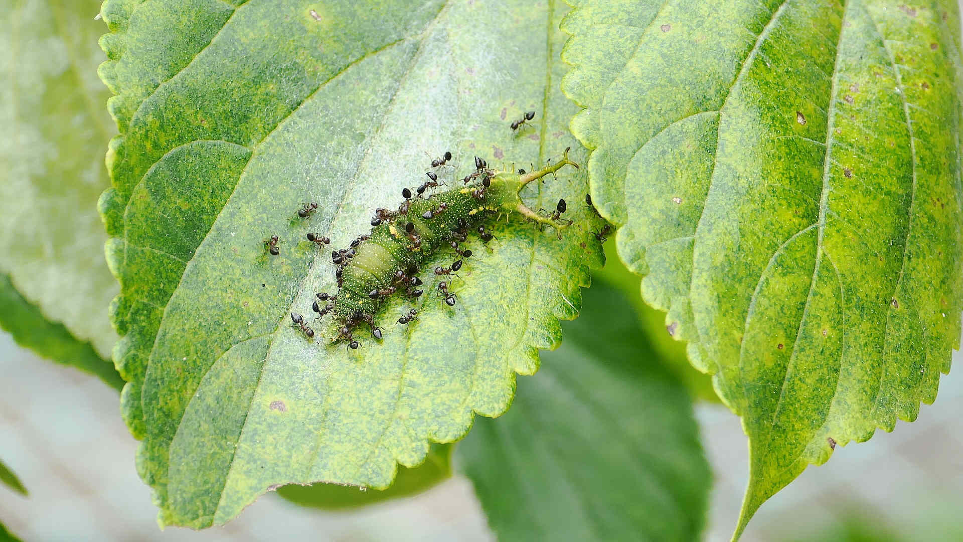 今日の一枚_01。ゴマダラチョウ、幼虫。アリに捕食されている。天然塚公園。
