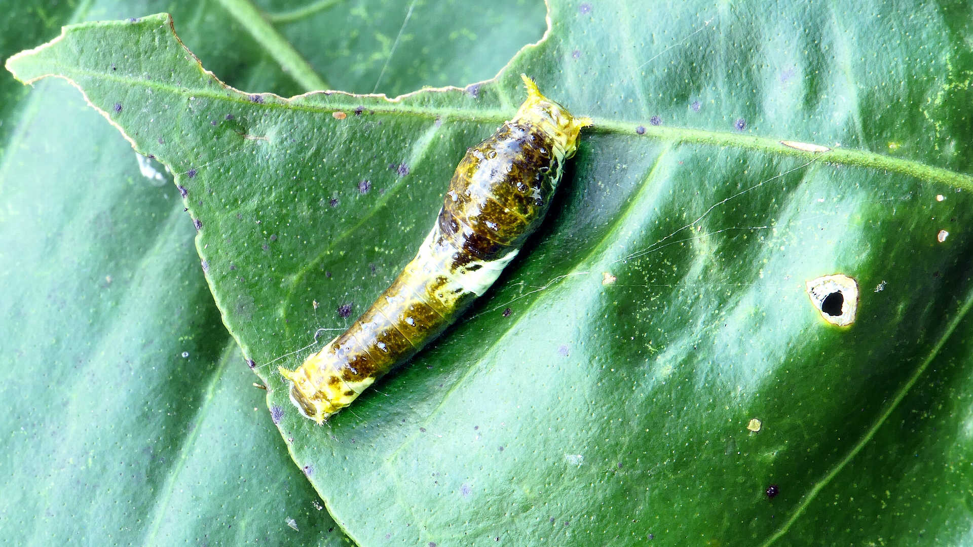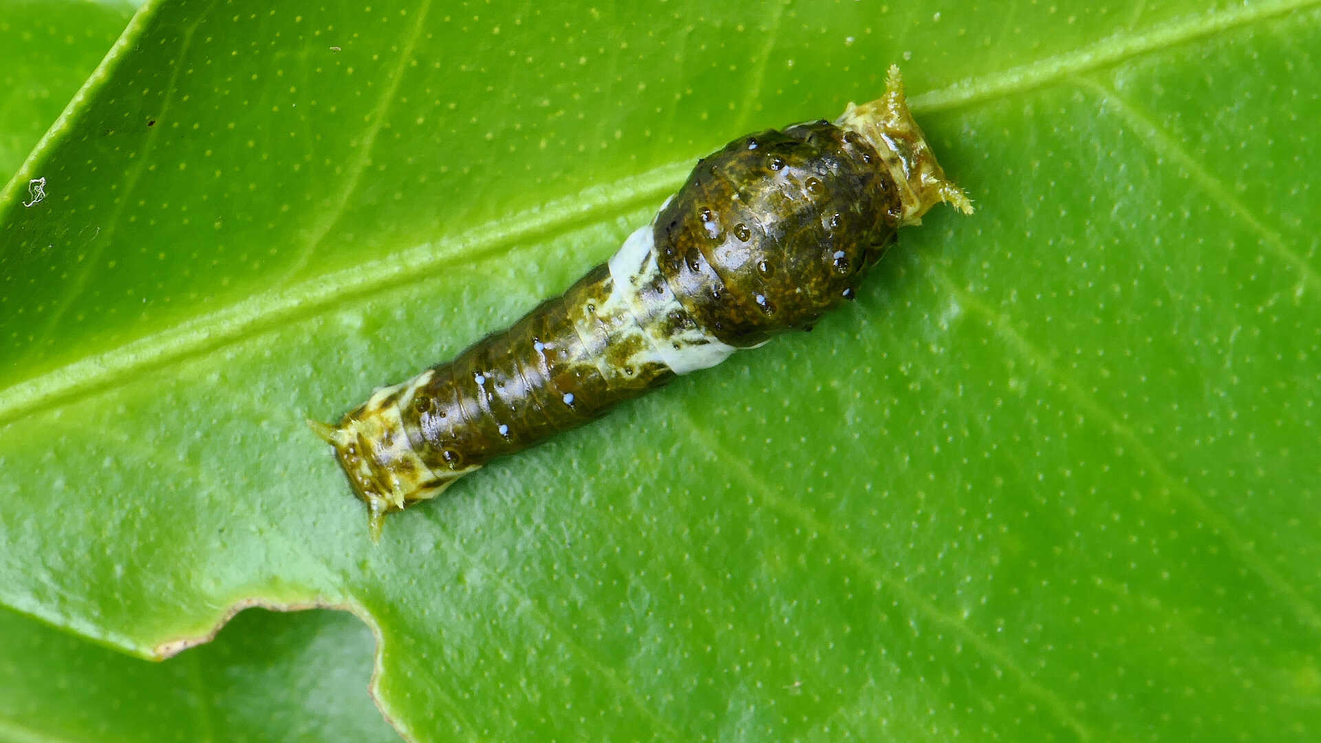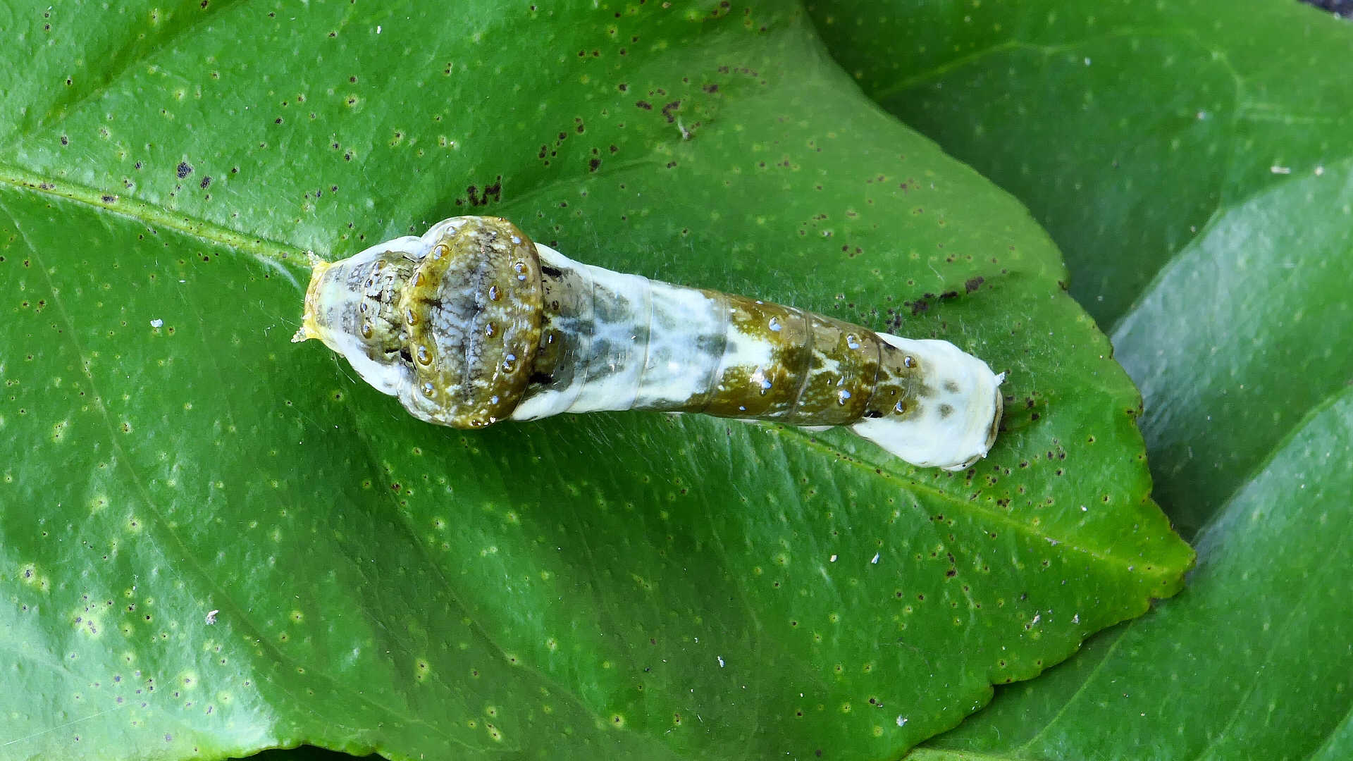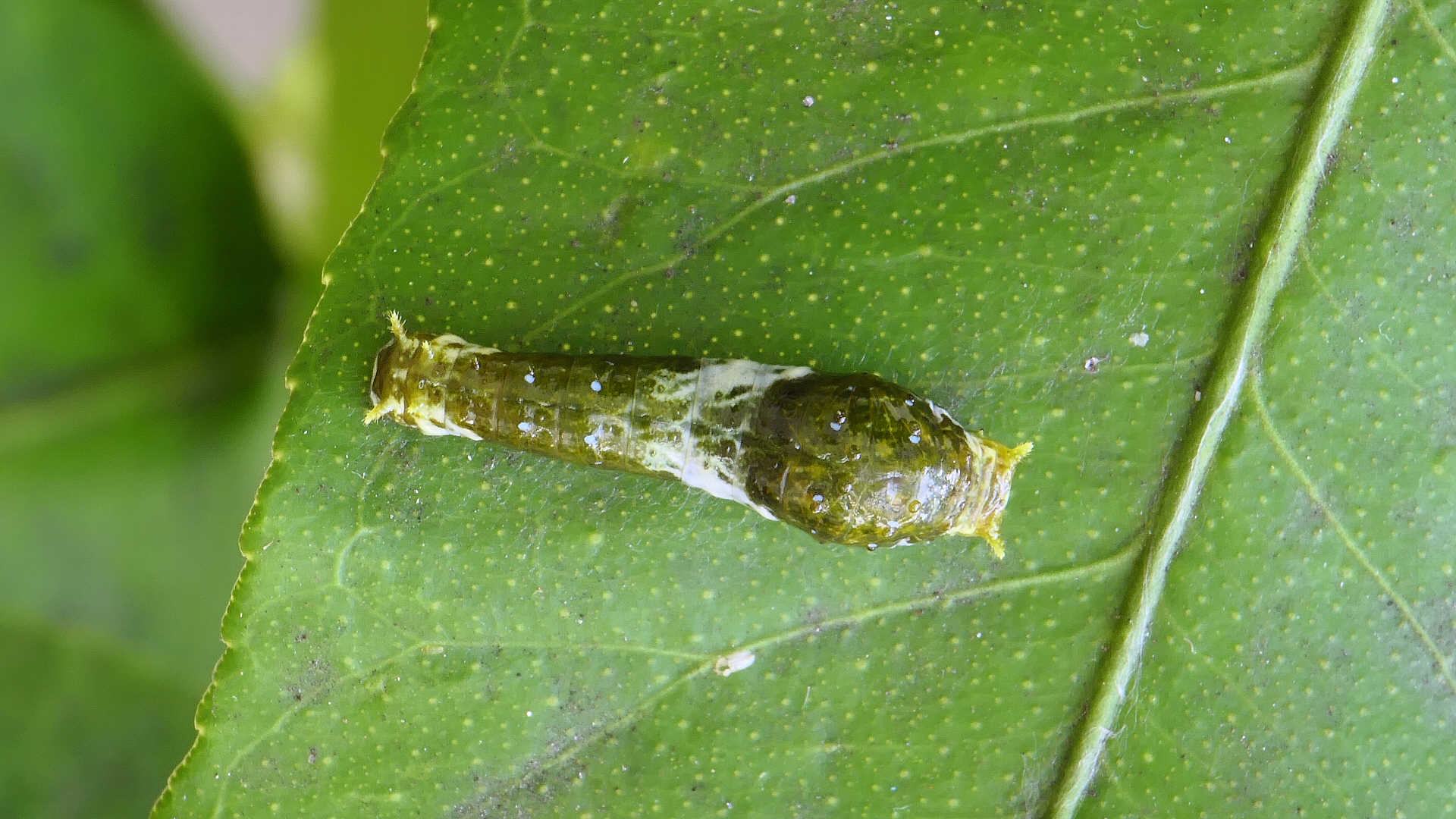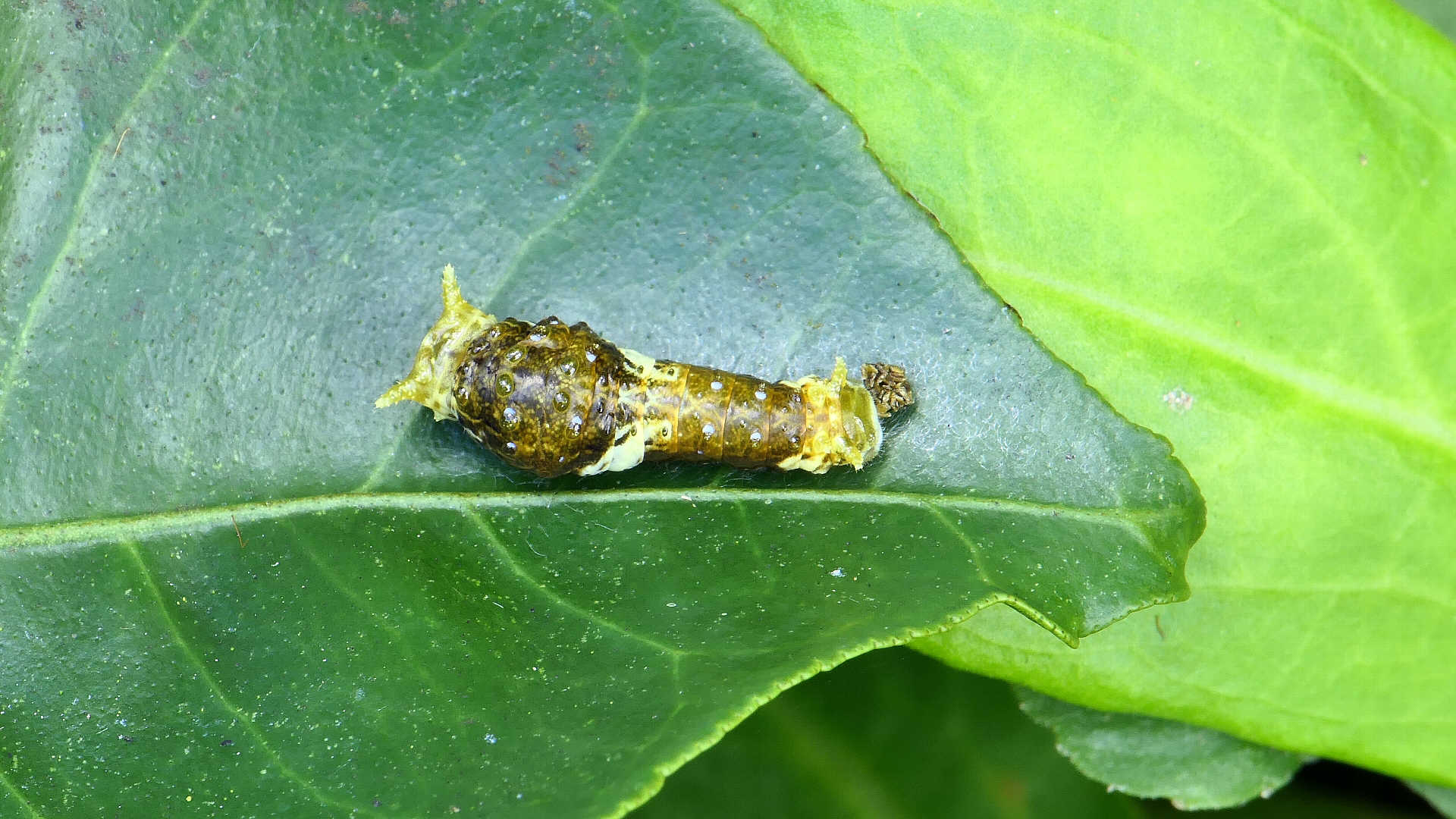 今日の一枚_01。ナガサキアゲハ、前蛹。纏わり付いていた寄生蜂は潰している。