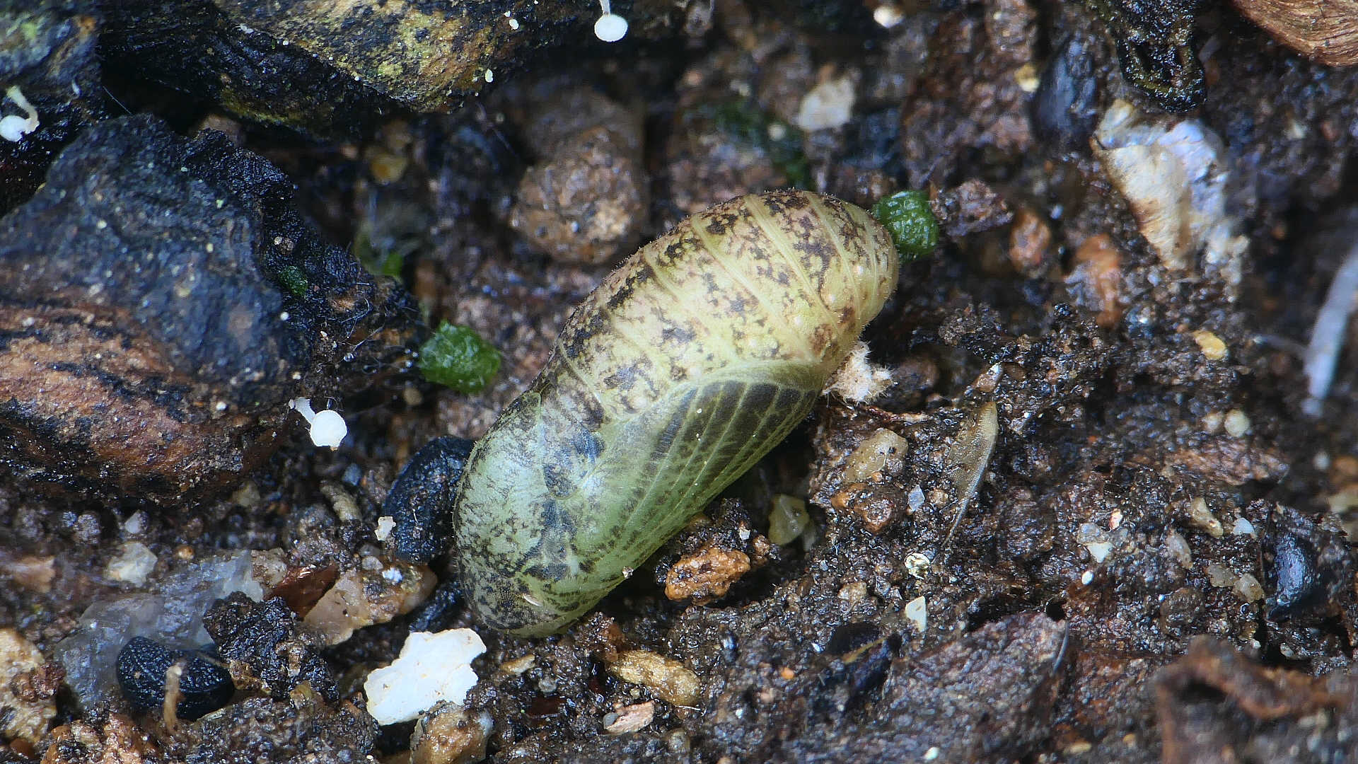 今日の一枚_01_01。ナガサキアゲハ、蛹。横。蛹に成って1時間ほど、まだ透明感がある。10月20日(月)の01と同じ個体。