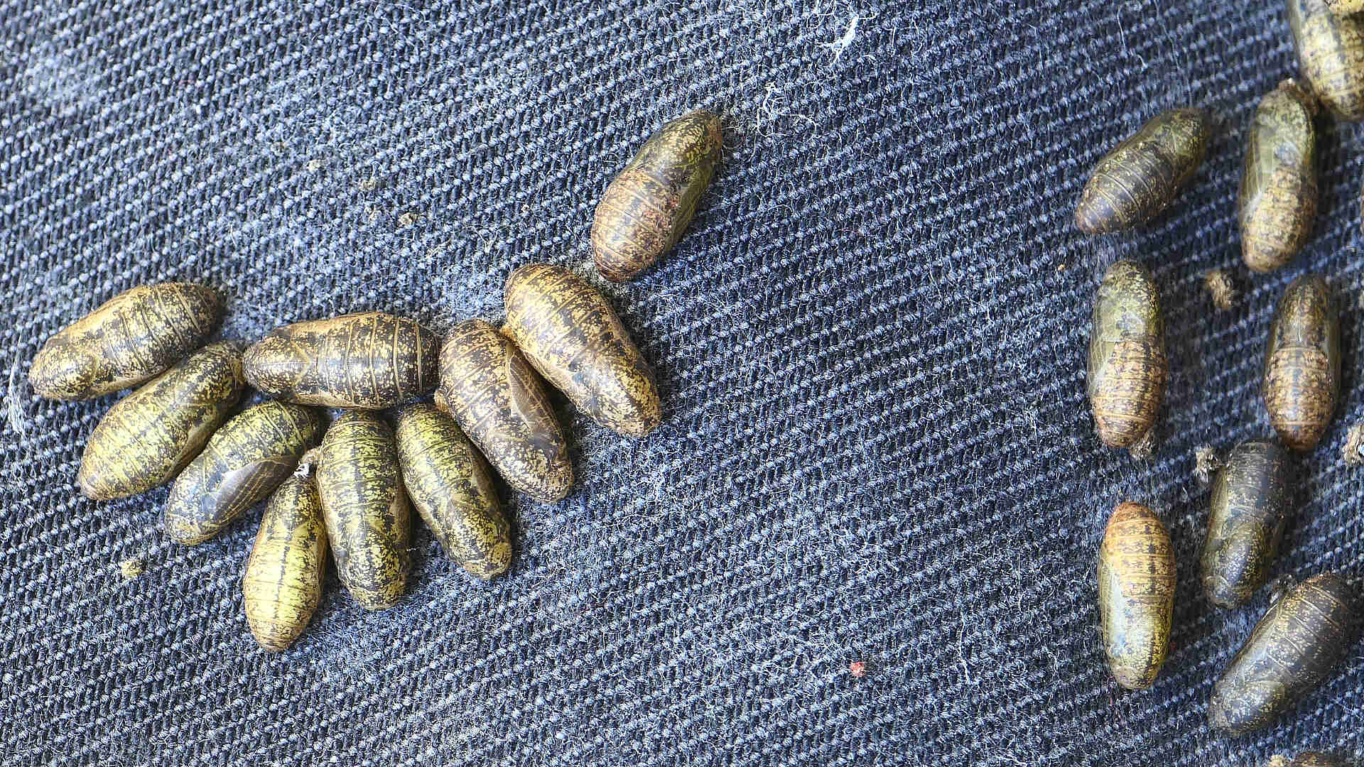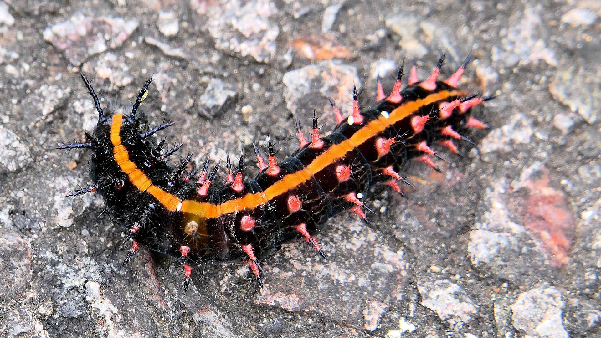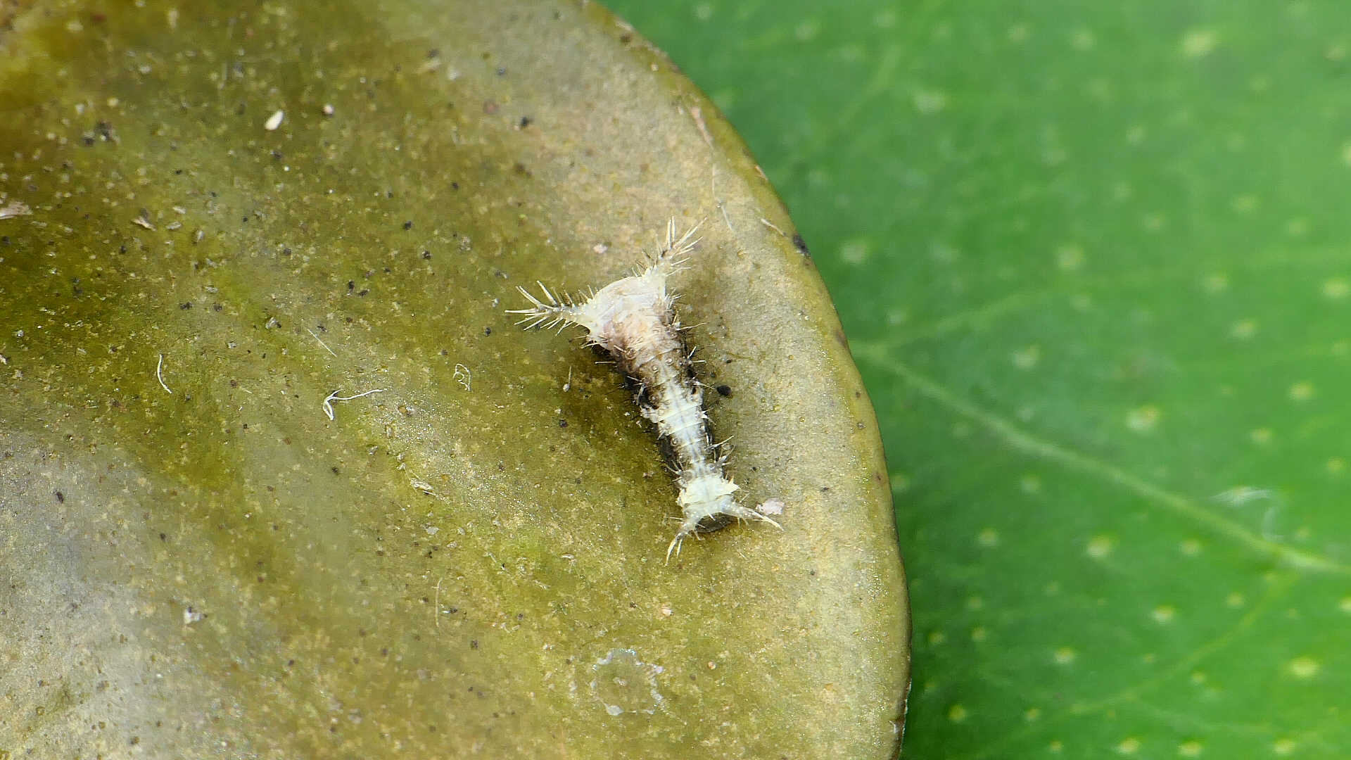 今日の一枚_03。ツマグロヒョウモン、幼虫。寄生蠅の卵が幾つも産み付けられている。大野川堤防道路。