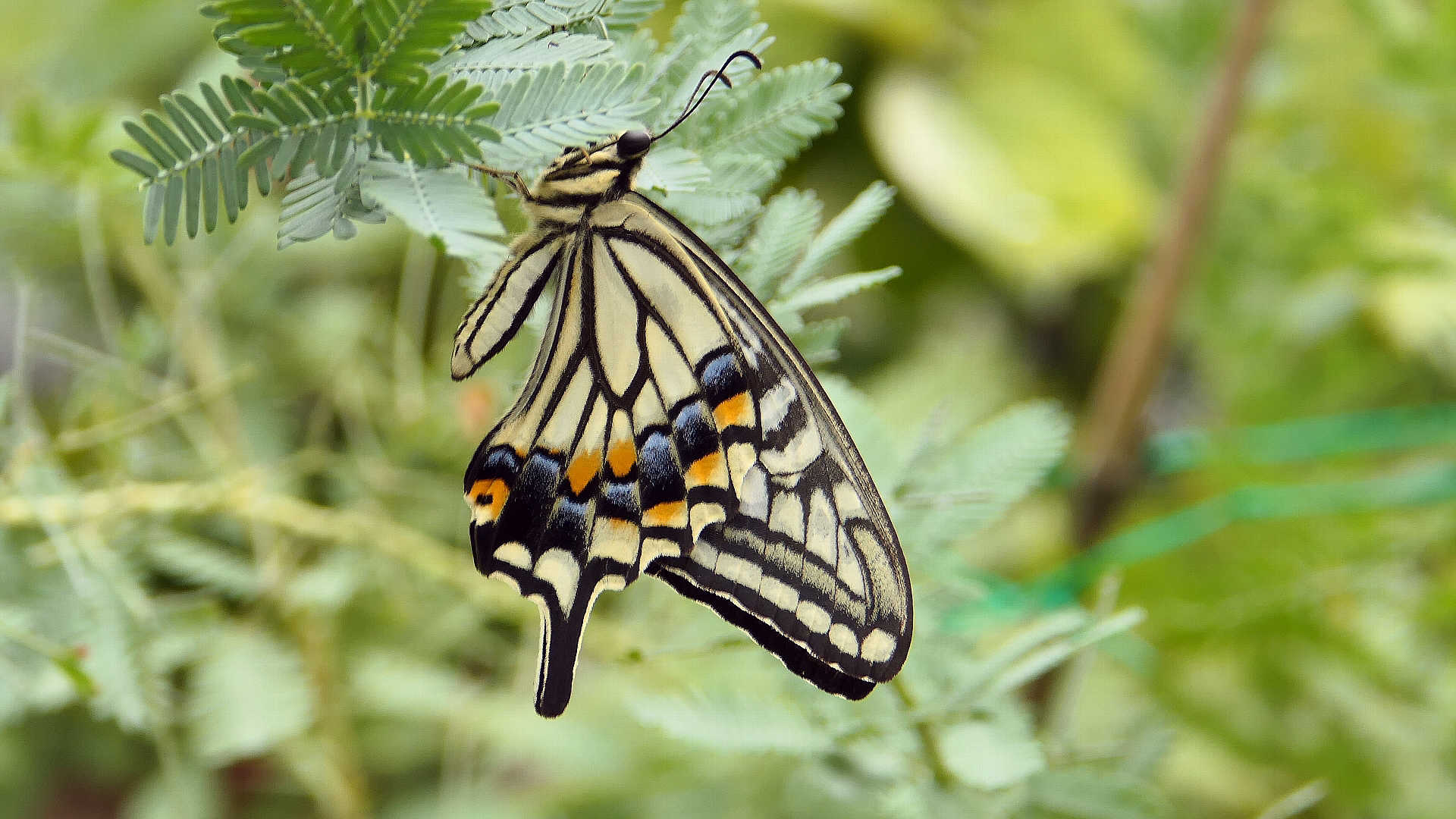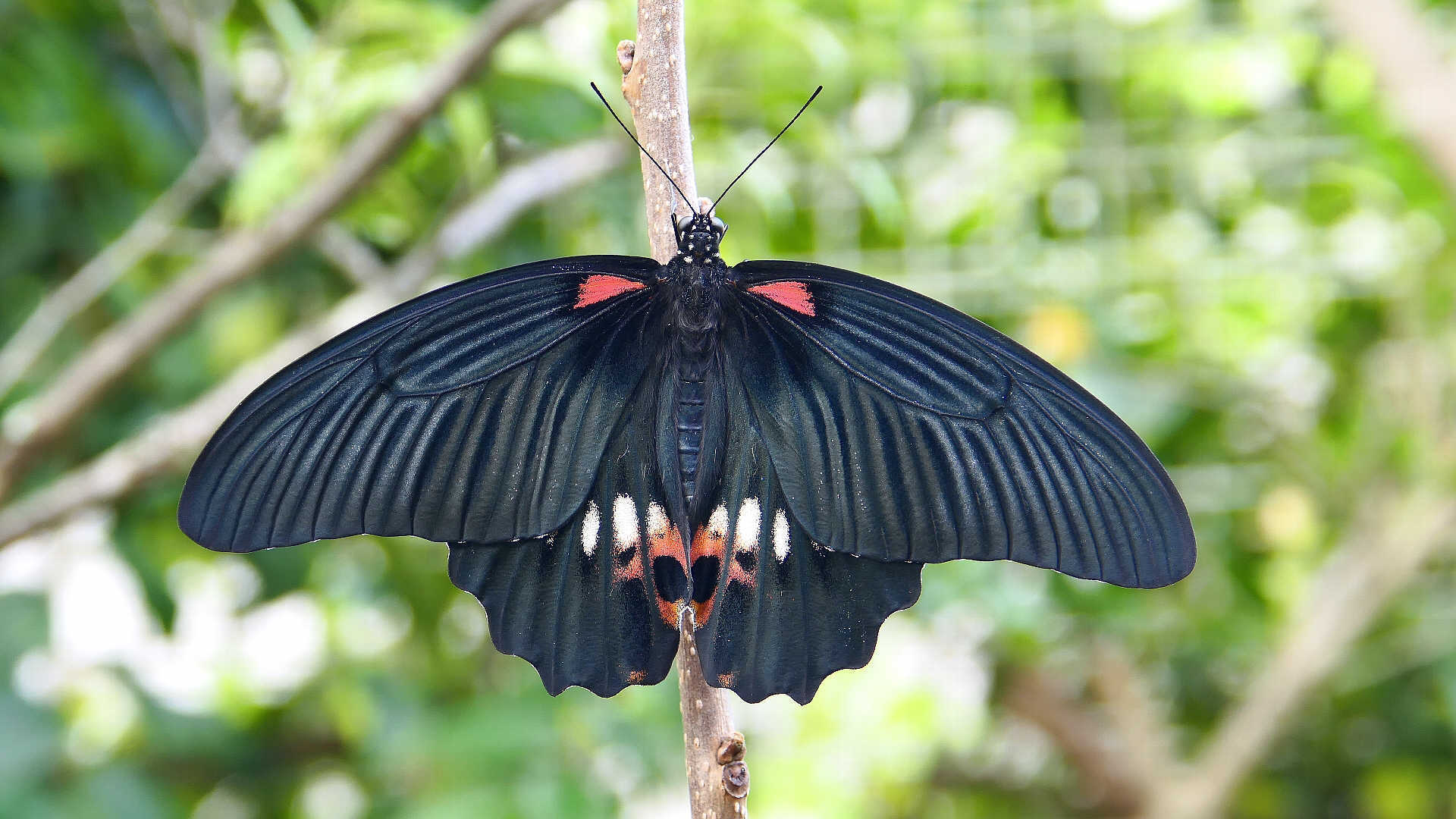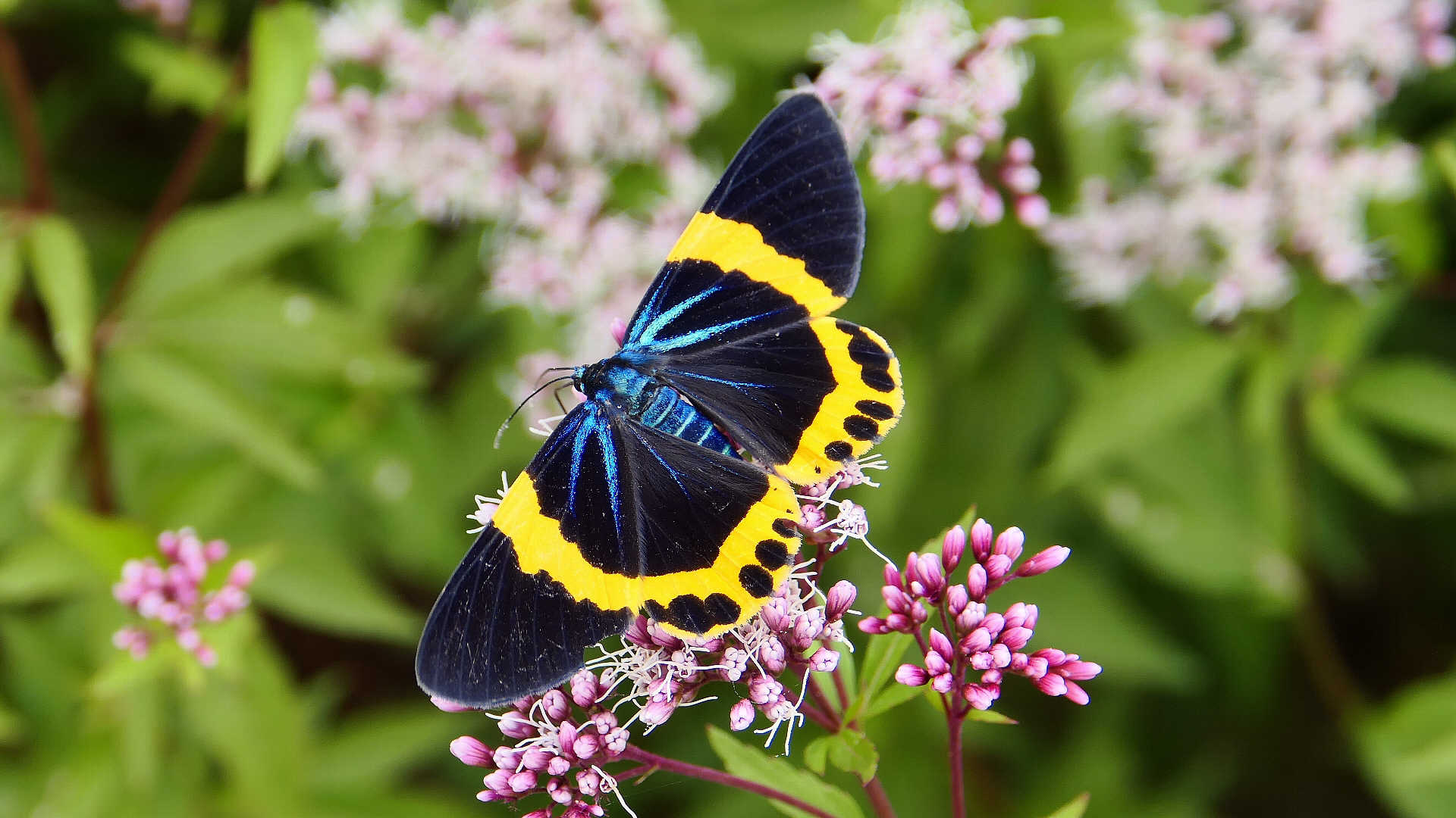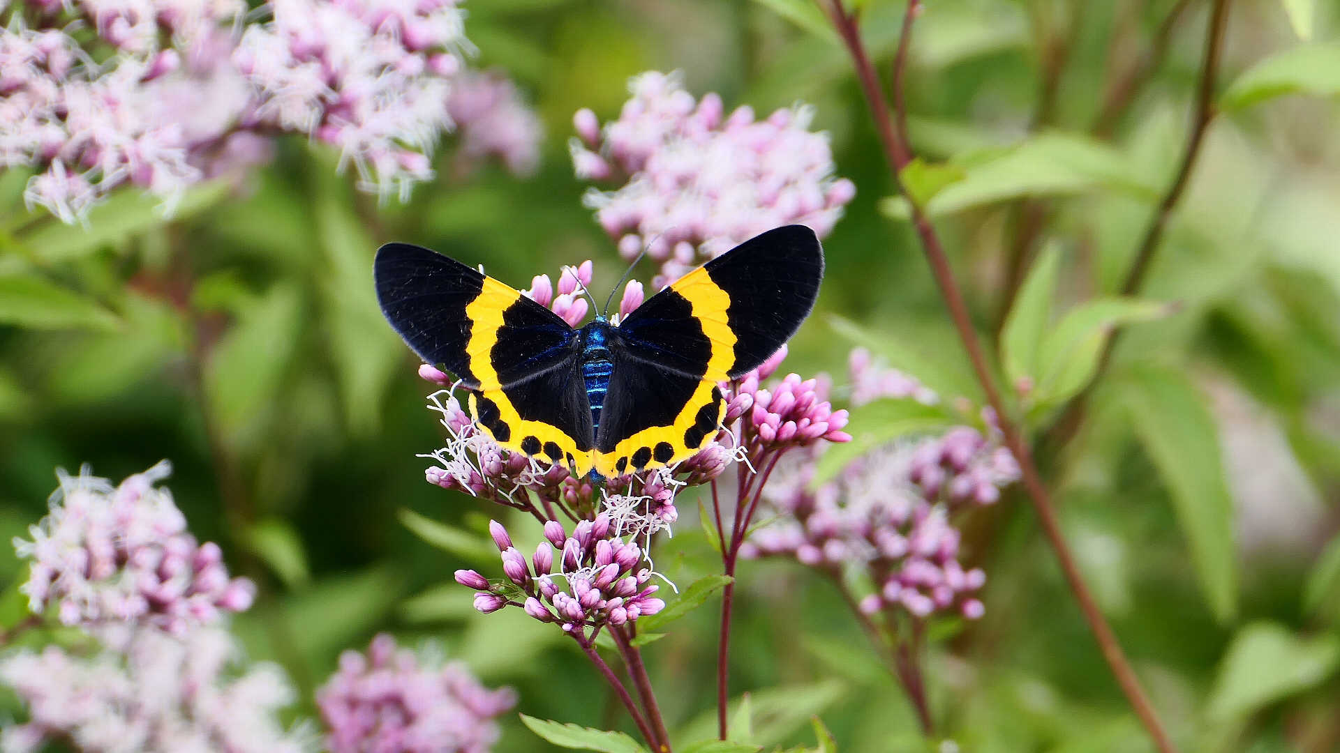 初めてキオビエダシャクを見たのはもう10年以上も前だと思う。日南市南郷町の県立トロピカルドーム(有用植物園)に行った時である。おお、見た事のない綺麗な蝶が沢山飛んでいる!見た事無いわ、これは撮らなきゃと次から次へと沢山撮っていたが突然に「あっ、これは違う!!!」と感じた。「蝶ではない、蛾だ!」と分かった事がある。以来キオビエダシャクには良い印象がない。詐欺師である。