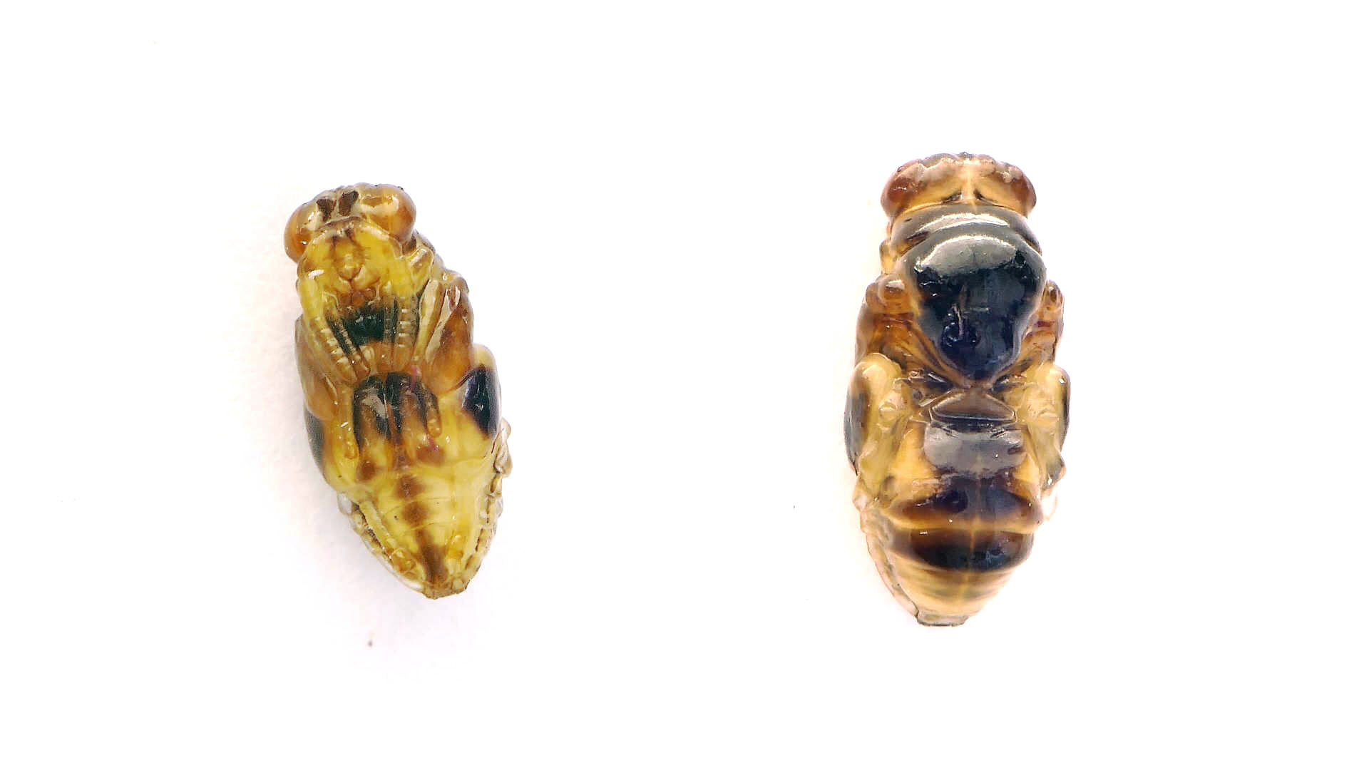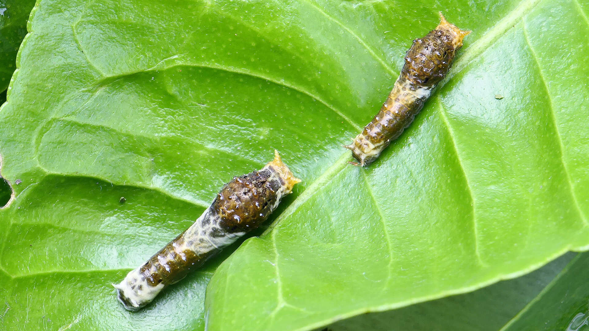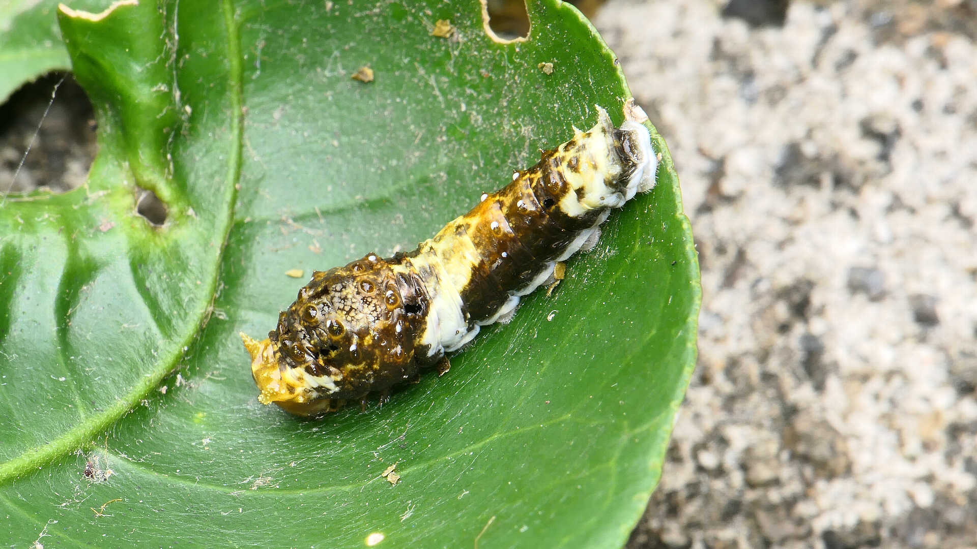 アゲハも虫籠の中で育てている。蛹に成ると白いウジ虫が時々出てくる。若齢幼虫を連れて帰って虫籠の中で育てているので、その時既に寄生されていたのだろう。ウジ虫を取り出して庭履きスリッパで踏み潰す。しかし、潰れない!!二度、三3度と踏み潰すが潰れない!!とても丈夫である。仕方ない、石をウジ虫の上に置いて踏み潰す。漸く潰れる。