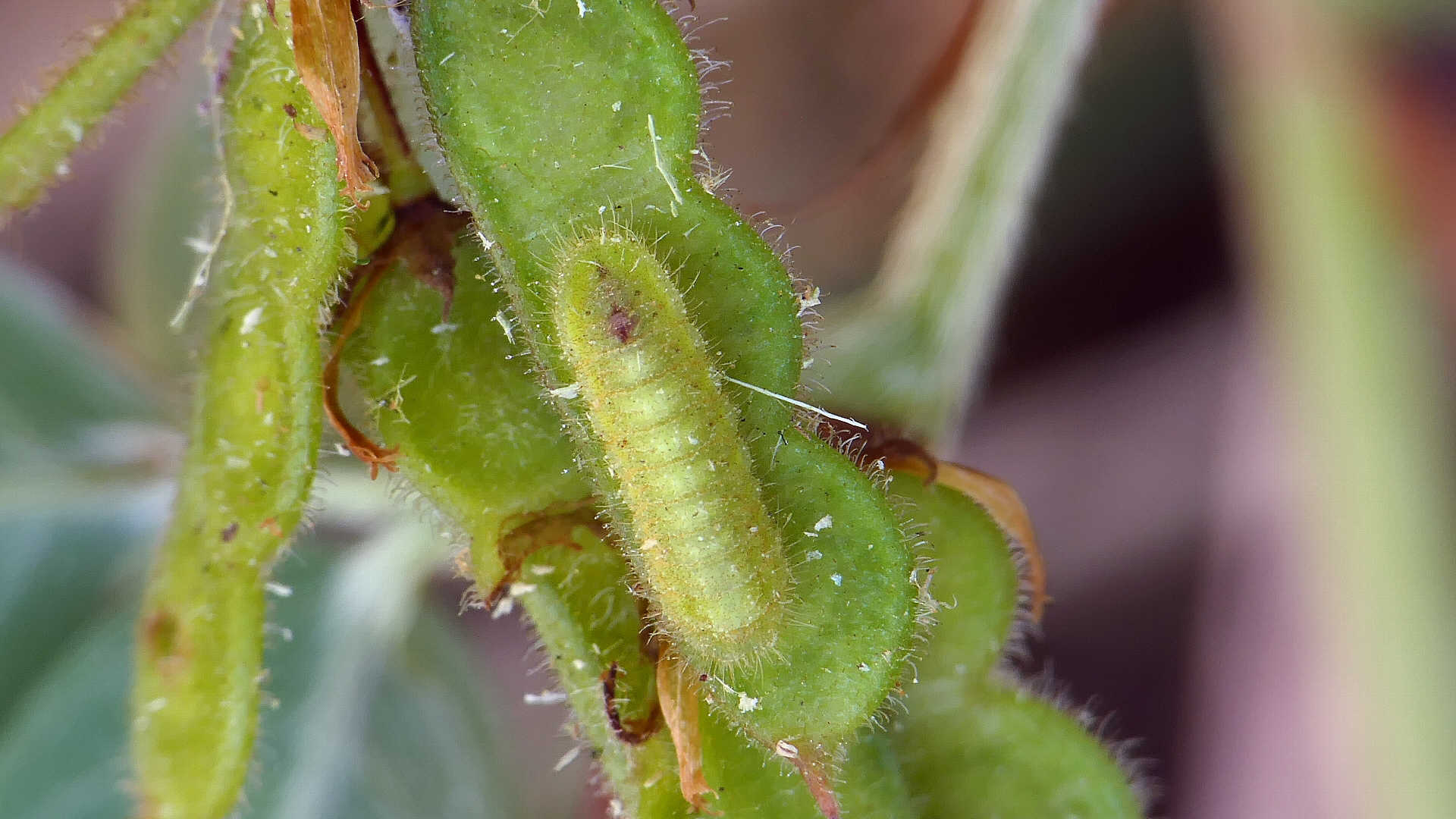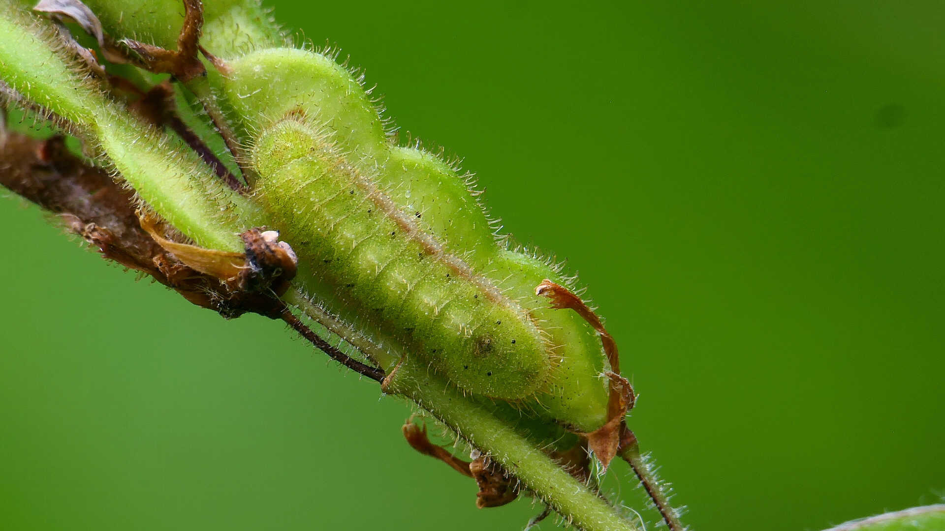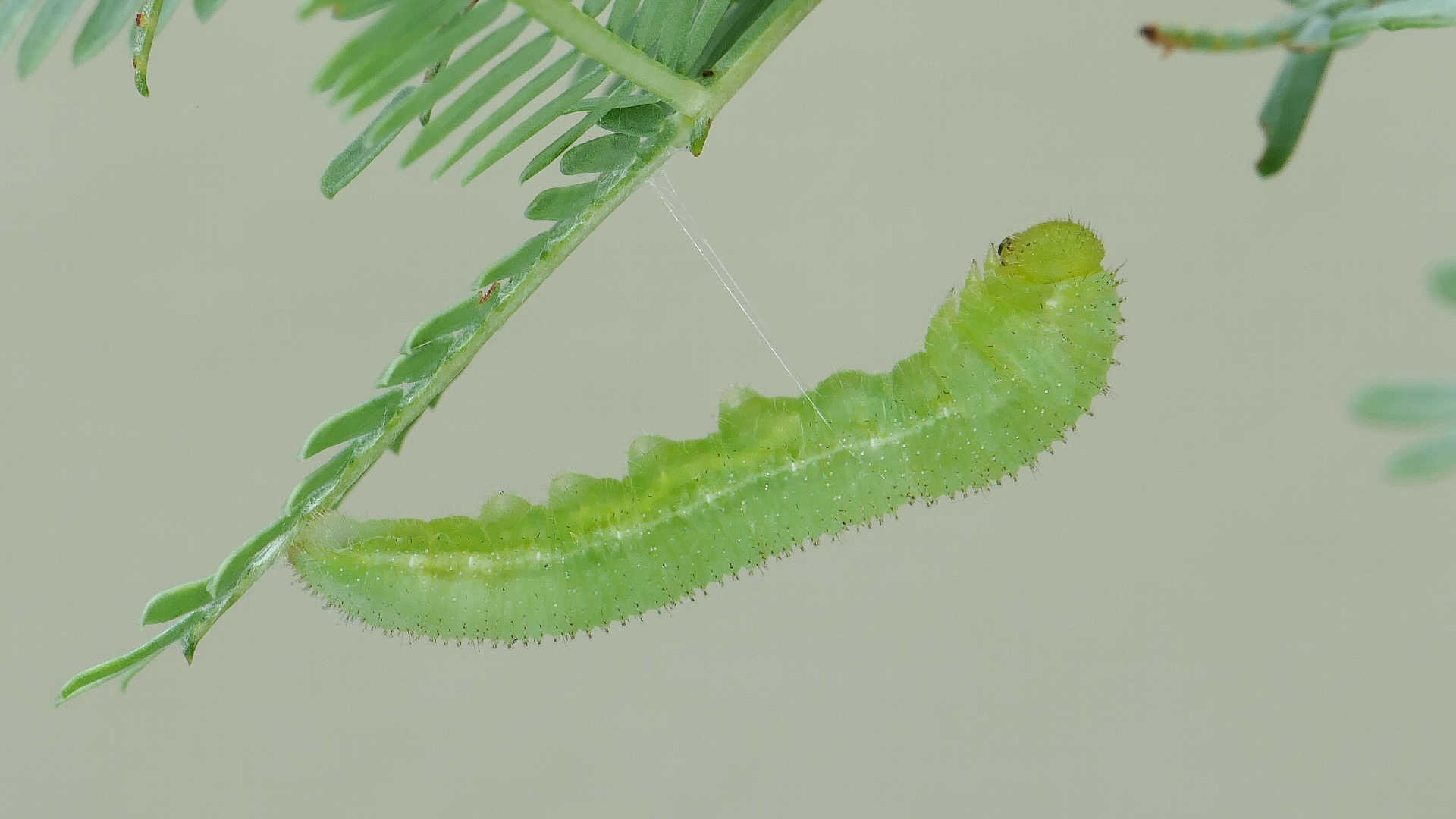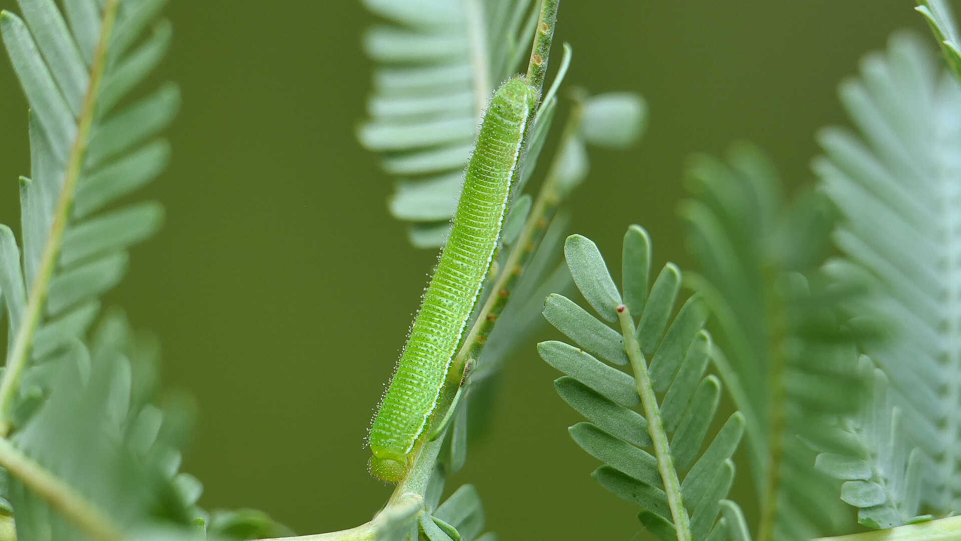 今日の一枚_01。コムラサキ、幼虫。頭部の茶色部分が薄緑を帯びてきた。令和7年2月28日(金)の01と同一個体。飼育。
