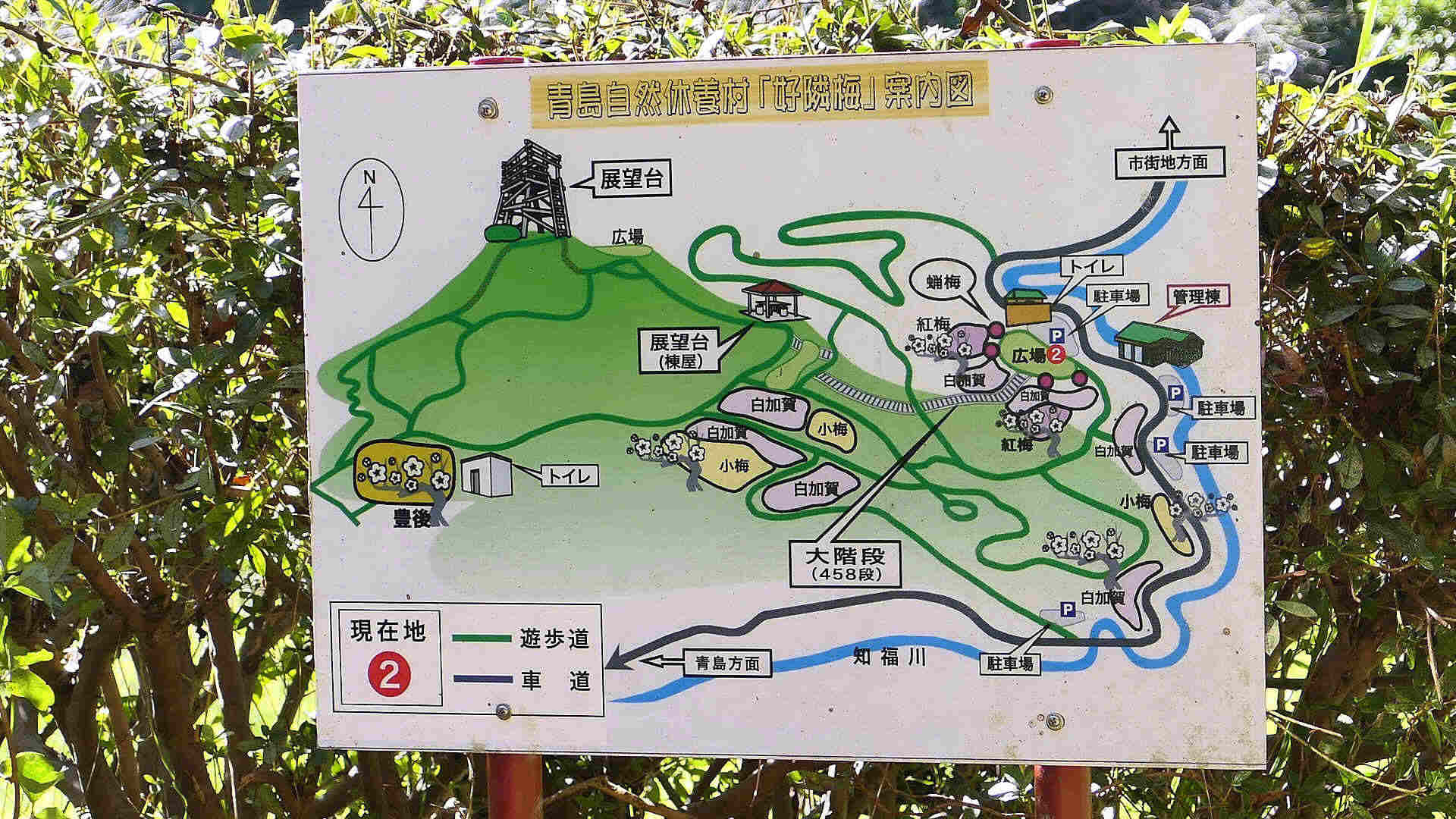 よし、此の示す様に進もうと、進んで行くと道は狭くなり、谷になった未舗装の道路となる。木材搬出中の表示もある。これは違うと引き返す。何処かで間違ったのだろう、標識はないかと探しながらゆっくり走る。あった「好隣梅」の道しるべ。しかし、この道しるべはなんともやる気のない道しるべである。これでは見落とすだろうと思う。でも何とか好隣梅の駐車場にたどり着く。しかし、その周辺は湿っぽく日当たりも余り良くなくシバハギが生えているとは思えない環境である。