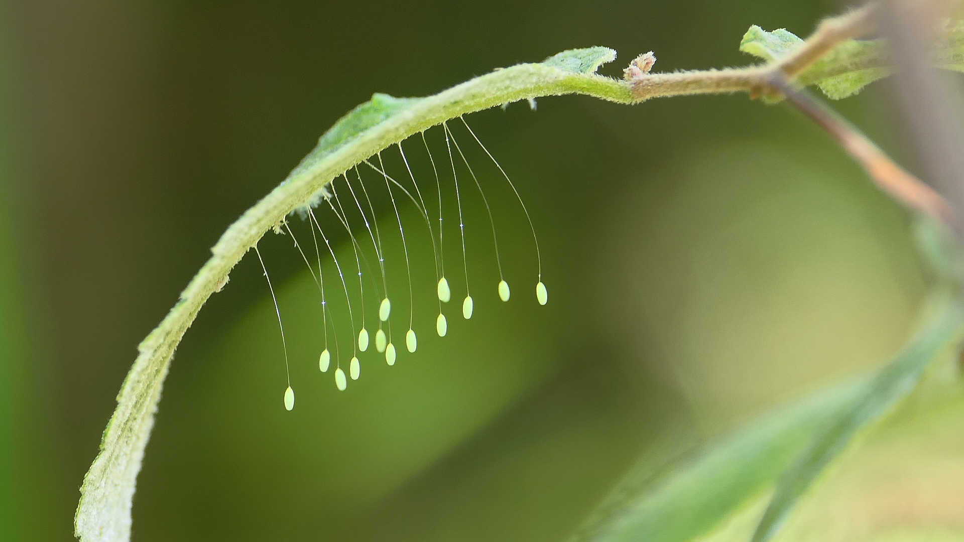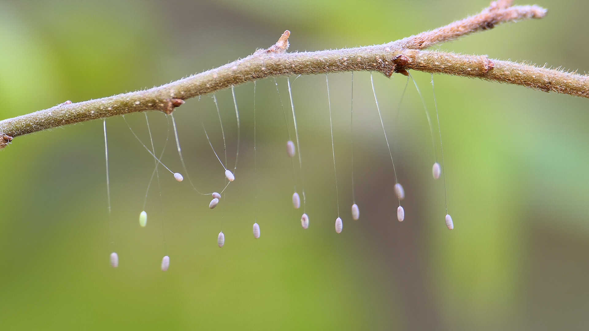 今日のおまけ_01。クサカゲロウ、卵。榎の葉裏に産卵。優曇華の花。子どもの頃、よく電灯の笠に産み付けられているのを見た事がある。昭和生まれは知っているだろう。