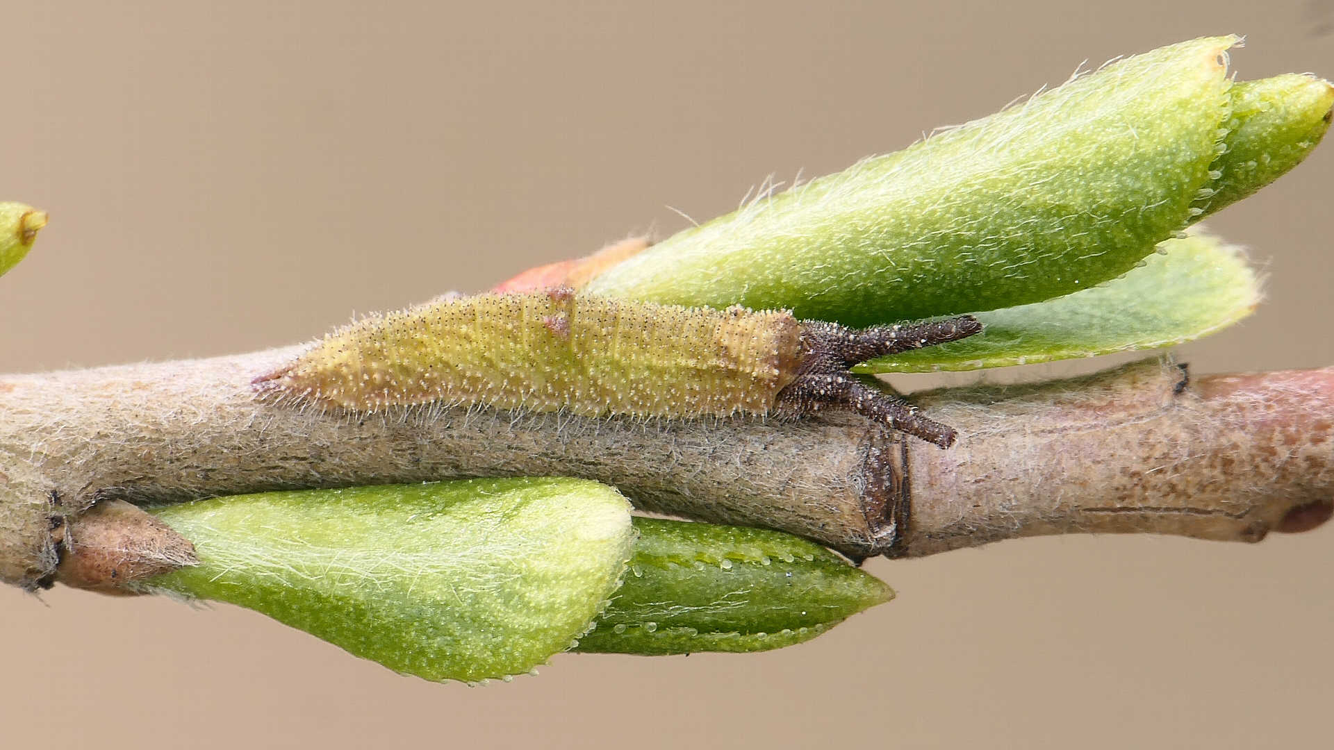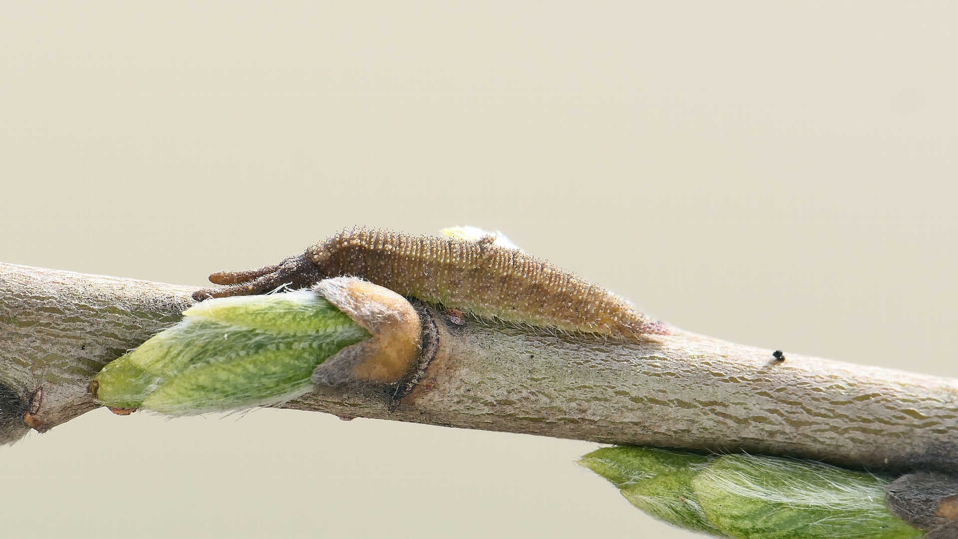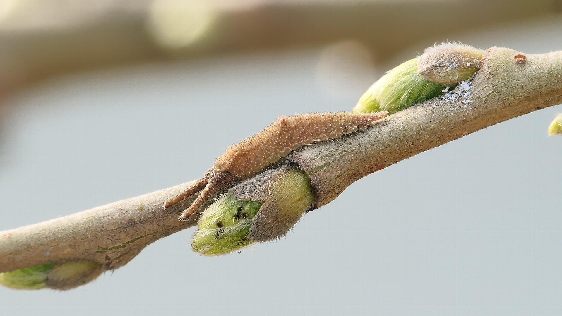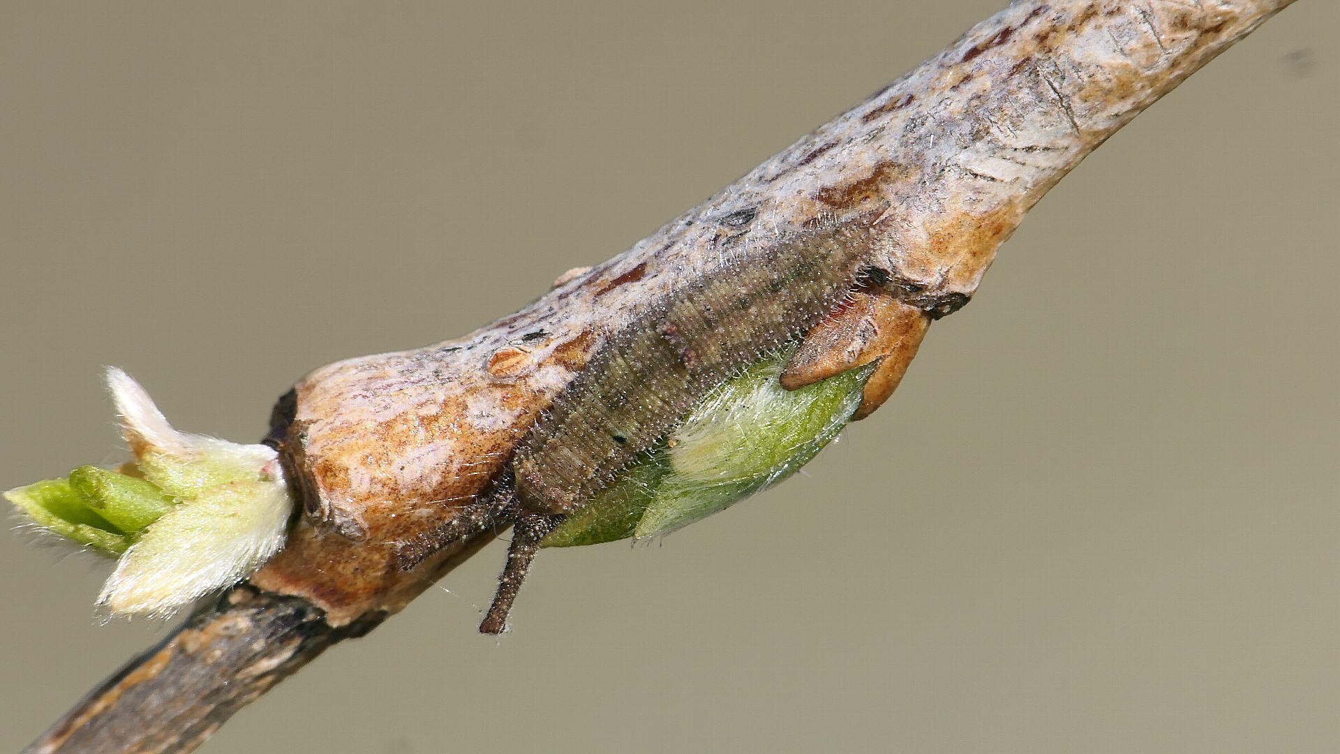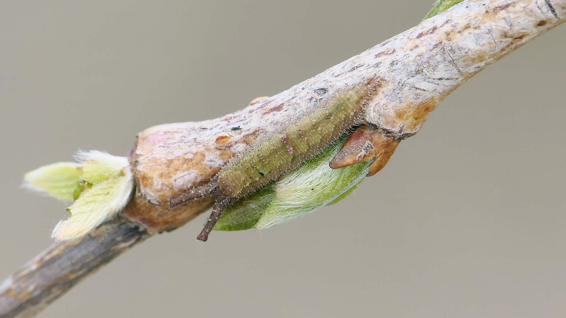 越冬から目覚めると、小枝の先に移動し新葉を囓って行く。小枝の途中には留まらない。体色は少しづつ茶から薄緑へと変わって行く。