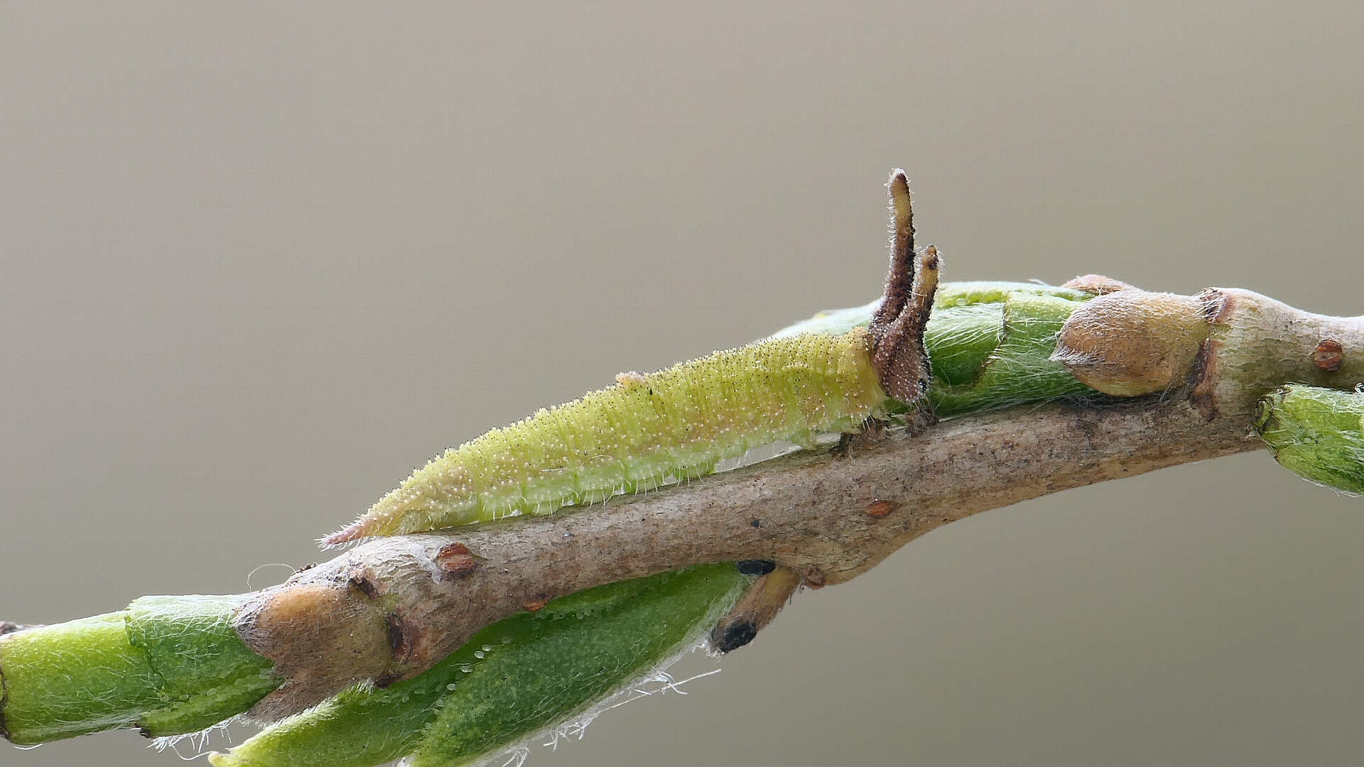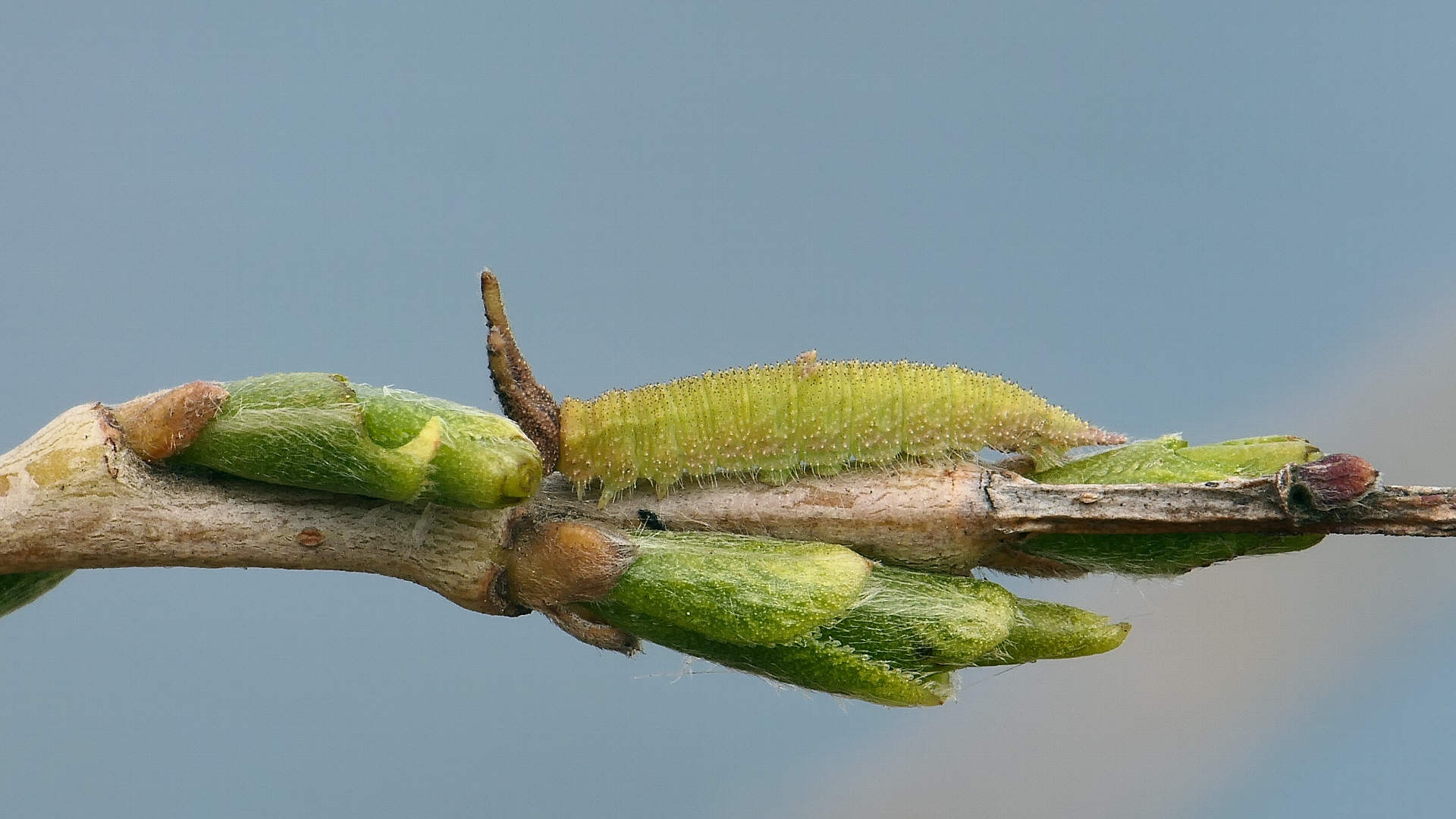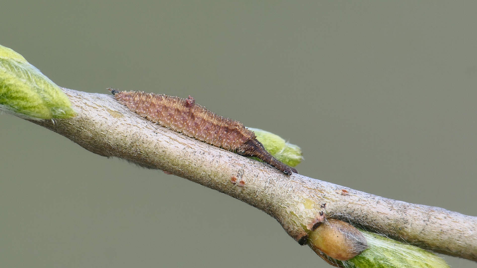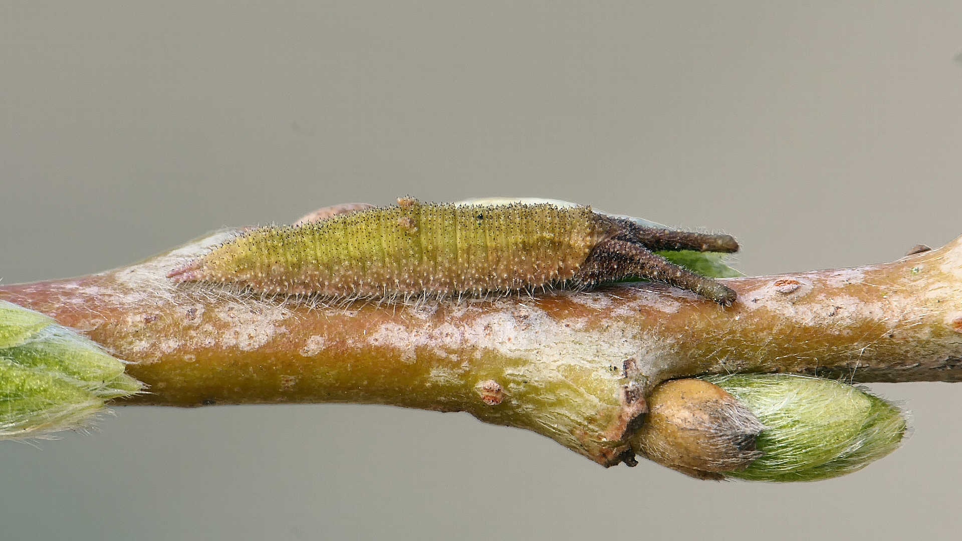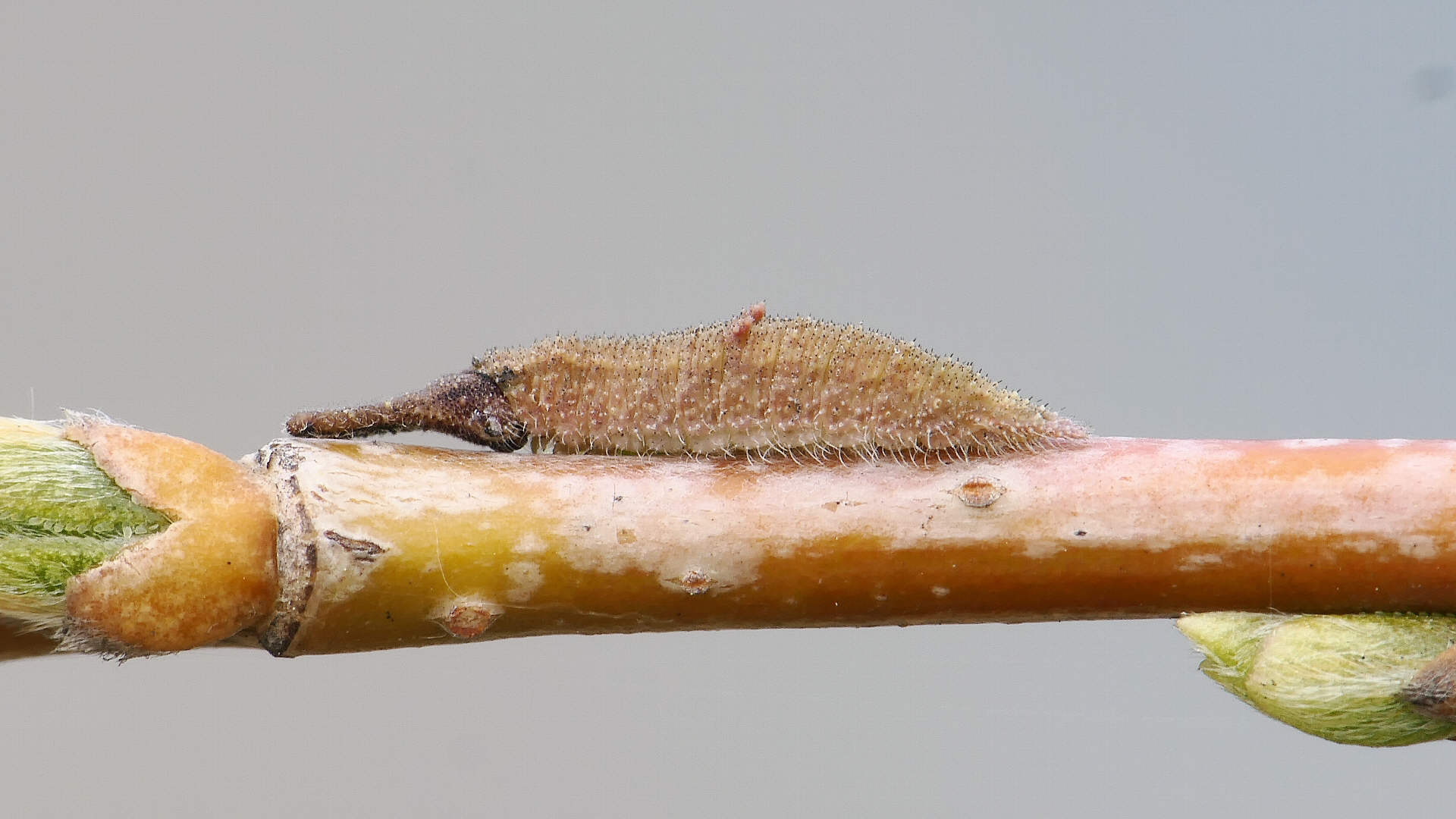 越冬から目覚めると、小枝の先に移動し新葉を囓って行く。小枝の途中には留まらない。体色は少しづつ茶から薄緑へと変わって行く。