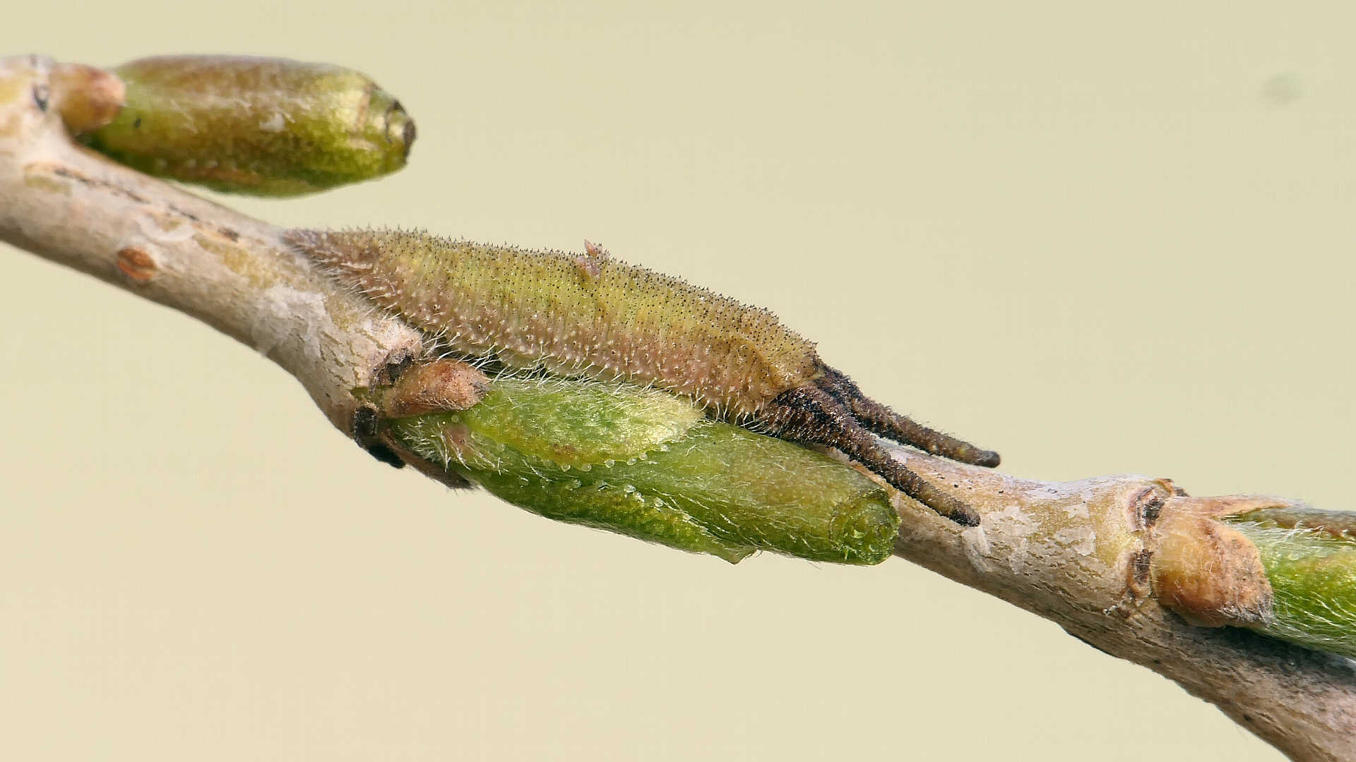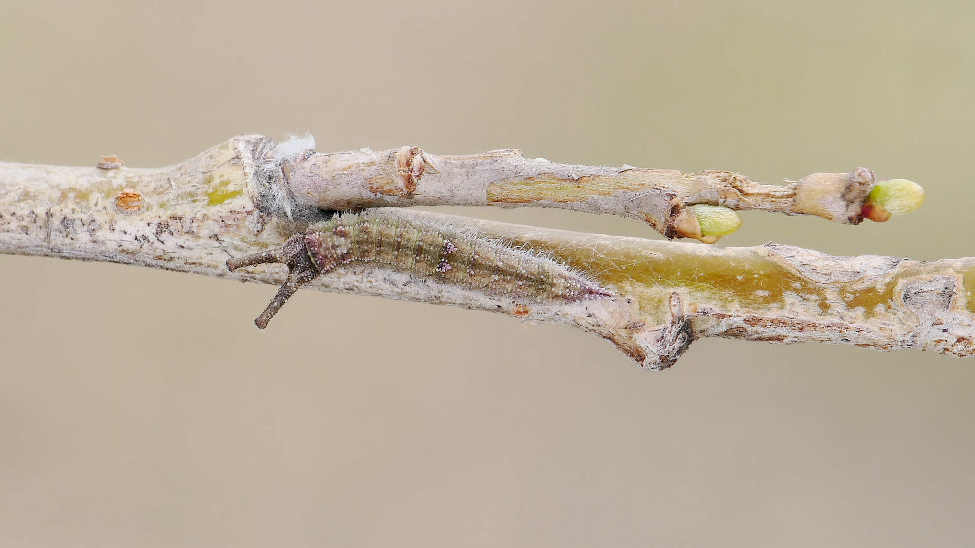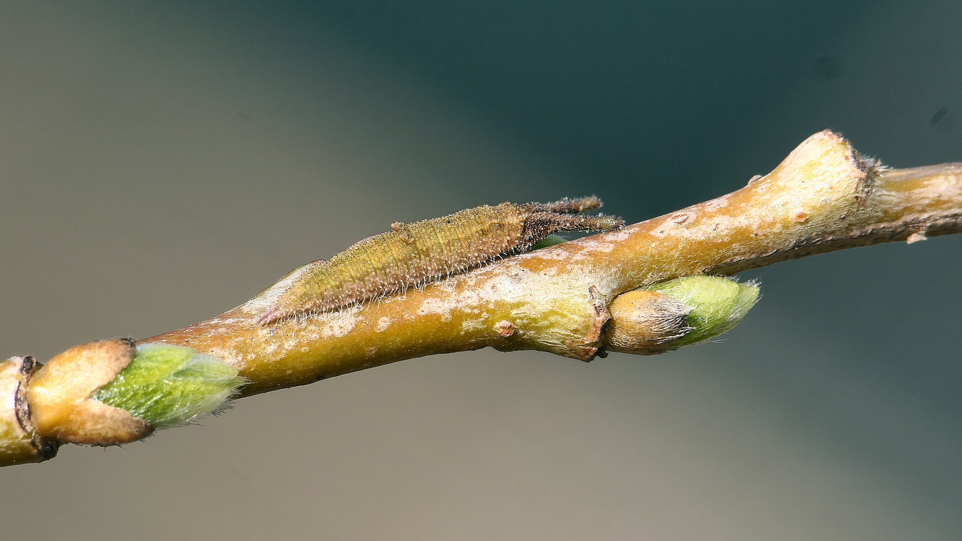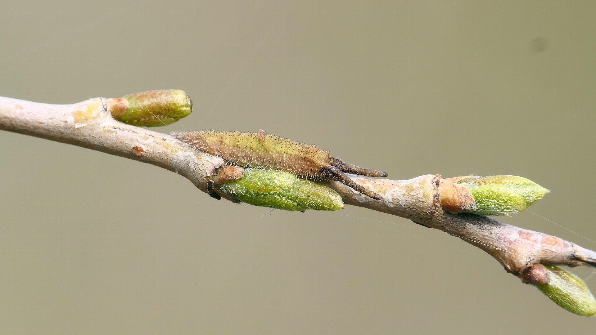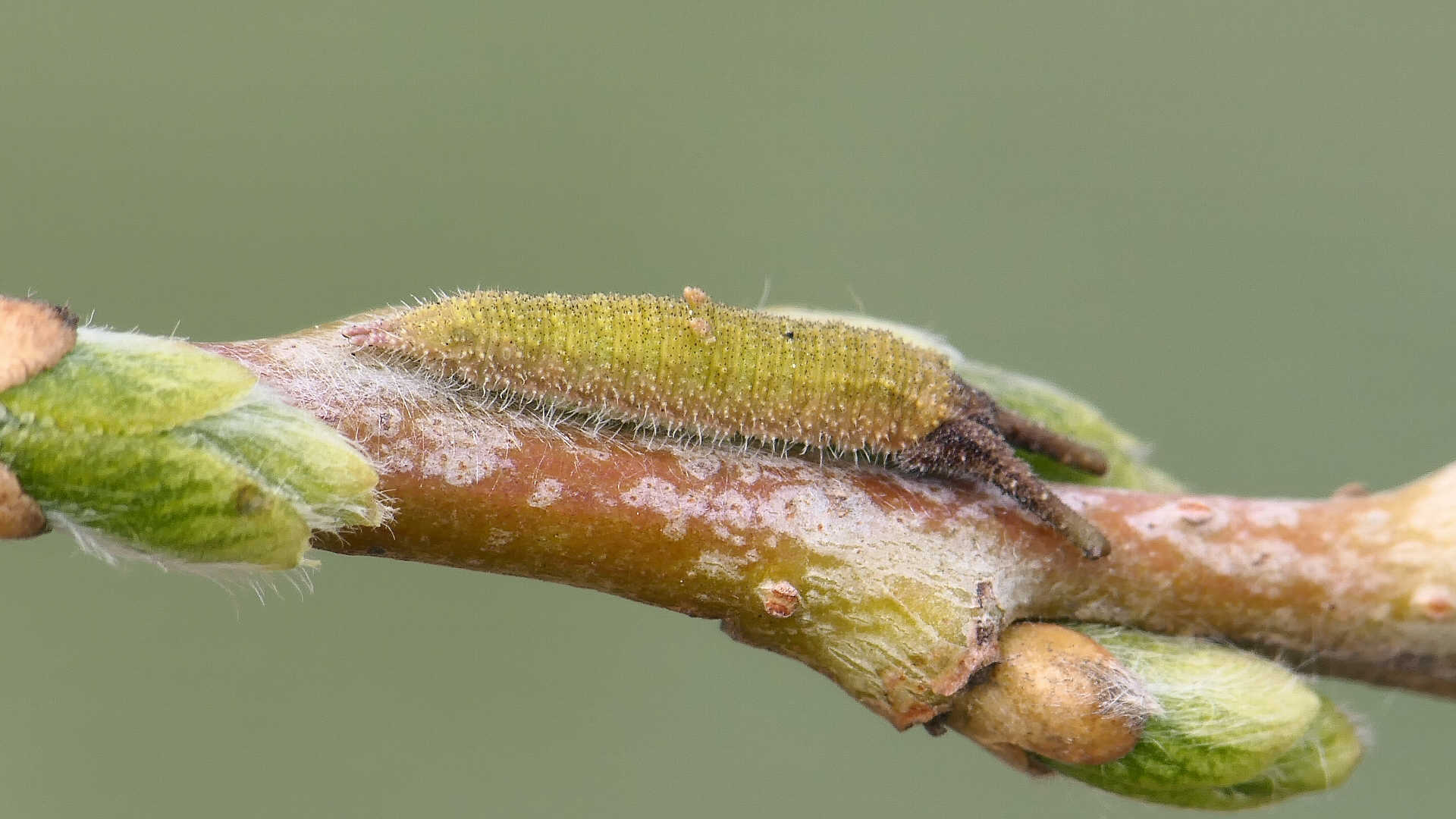 越冬から目覚めると、小枝の先に移動し新葉を囓って行く。小枝の途中には留まらない。体色は少しづつ茶から薄緑へと変わって行く。