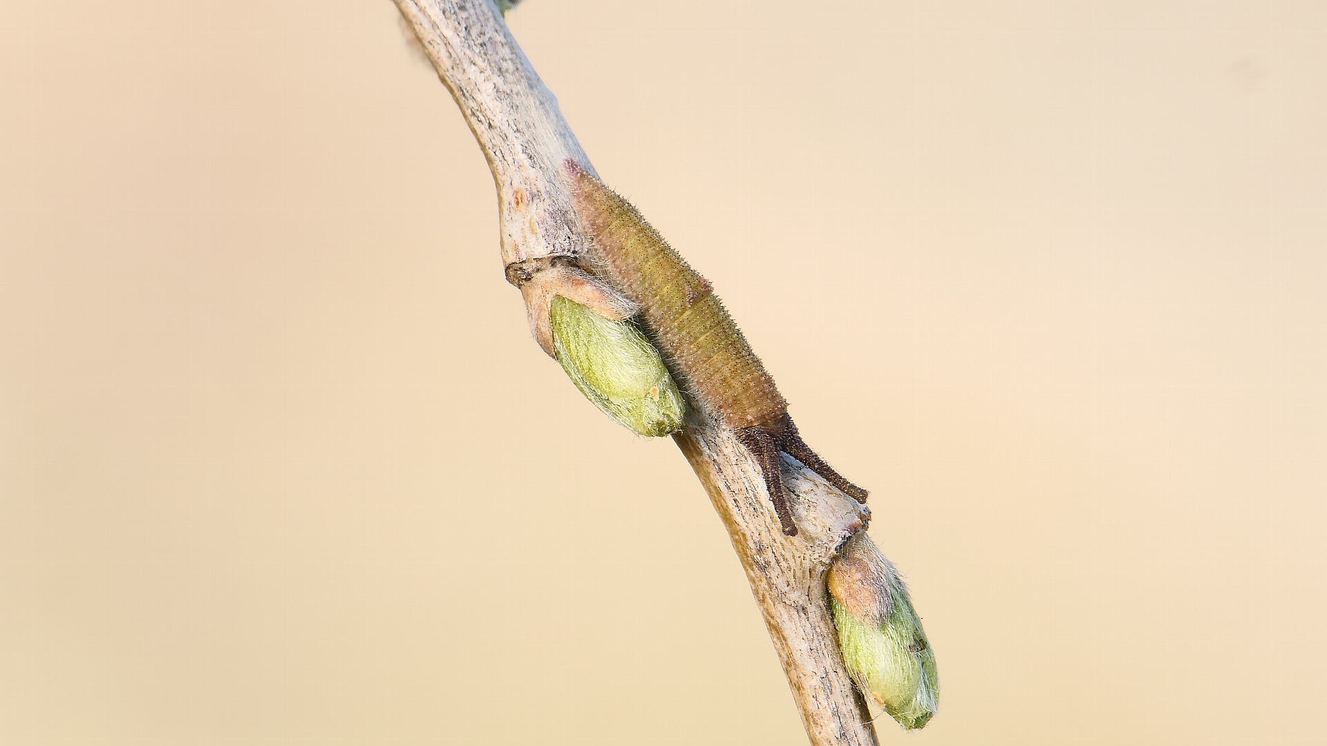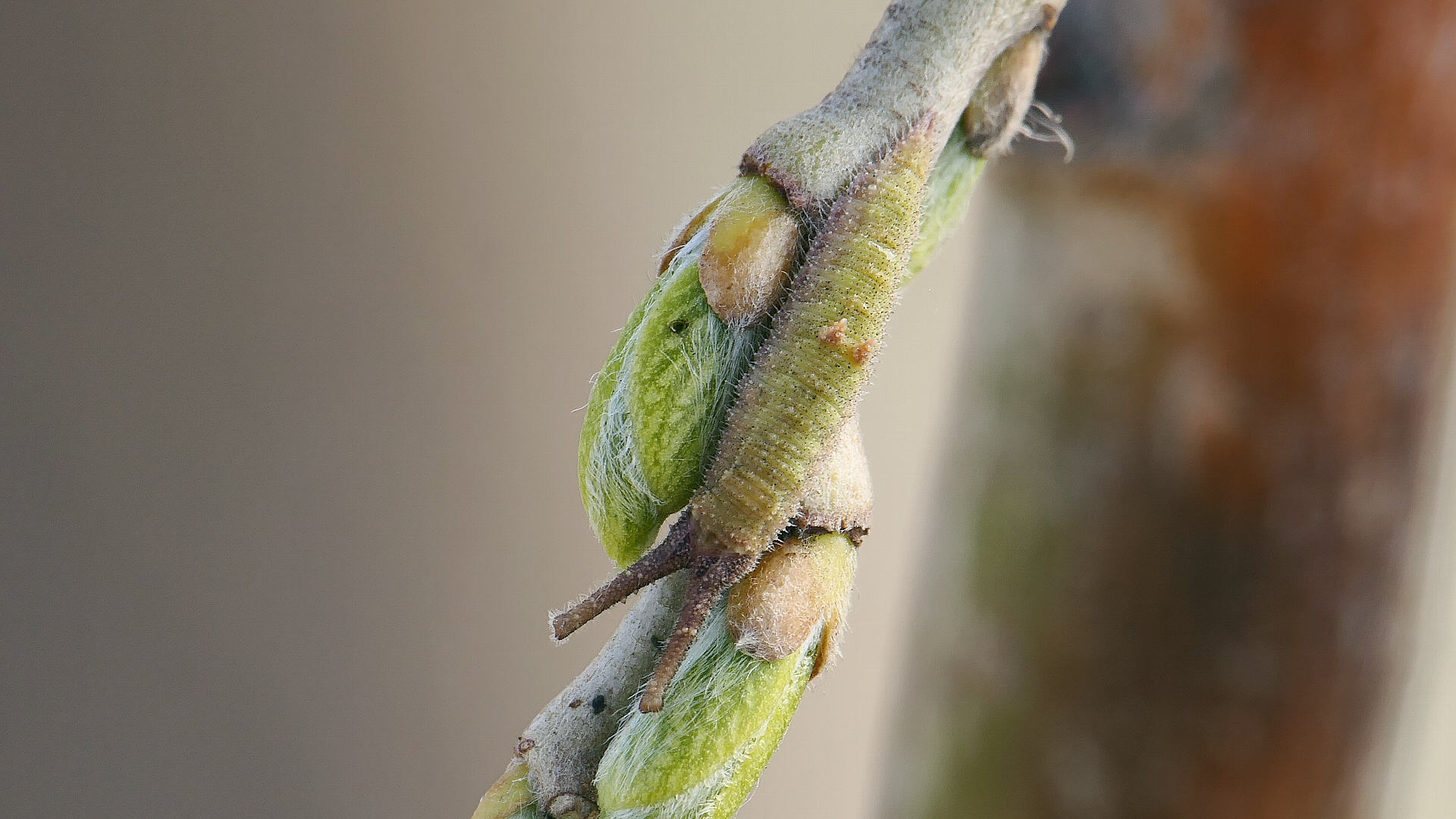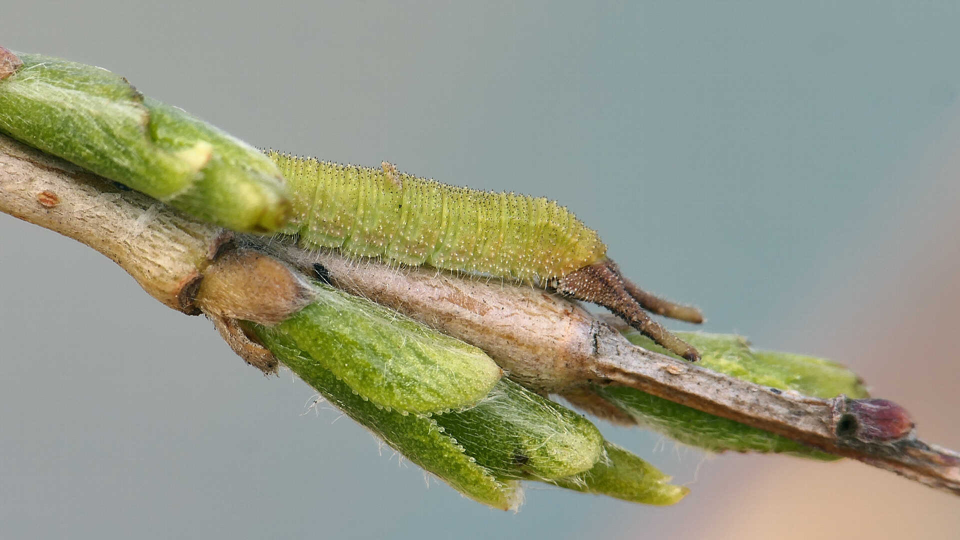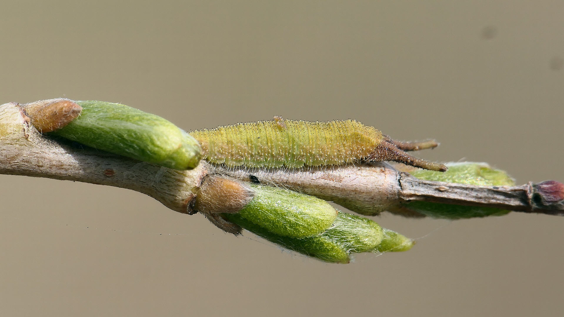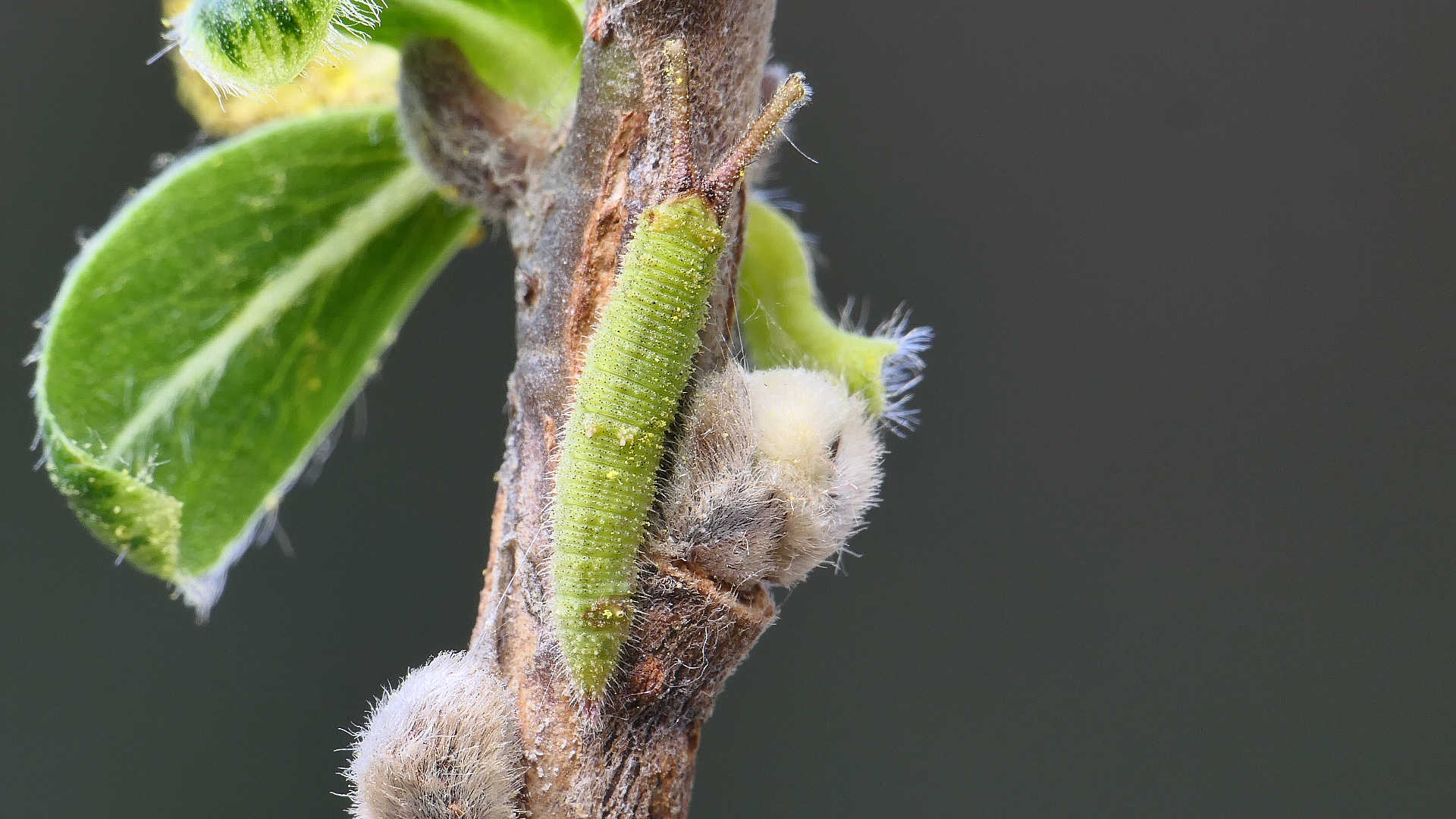 越冬から目覚めると、小枝の先に移動し新葉を囓って行く。小枝の途中には留まらない。体色は少しづつ茶から薄緑へと変わって行く。