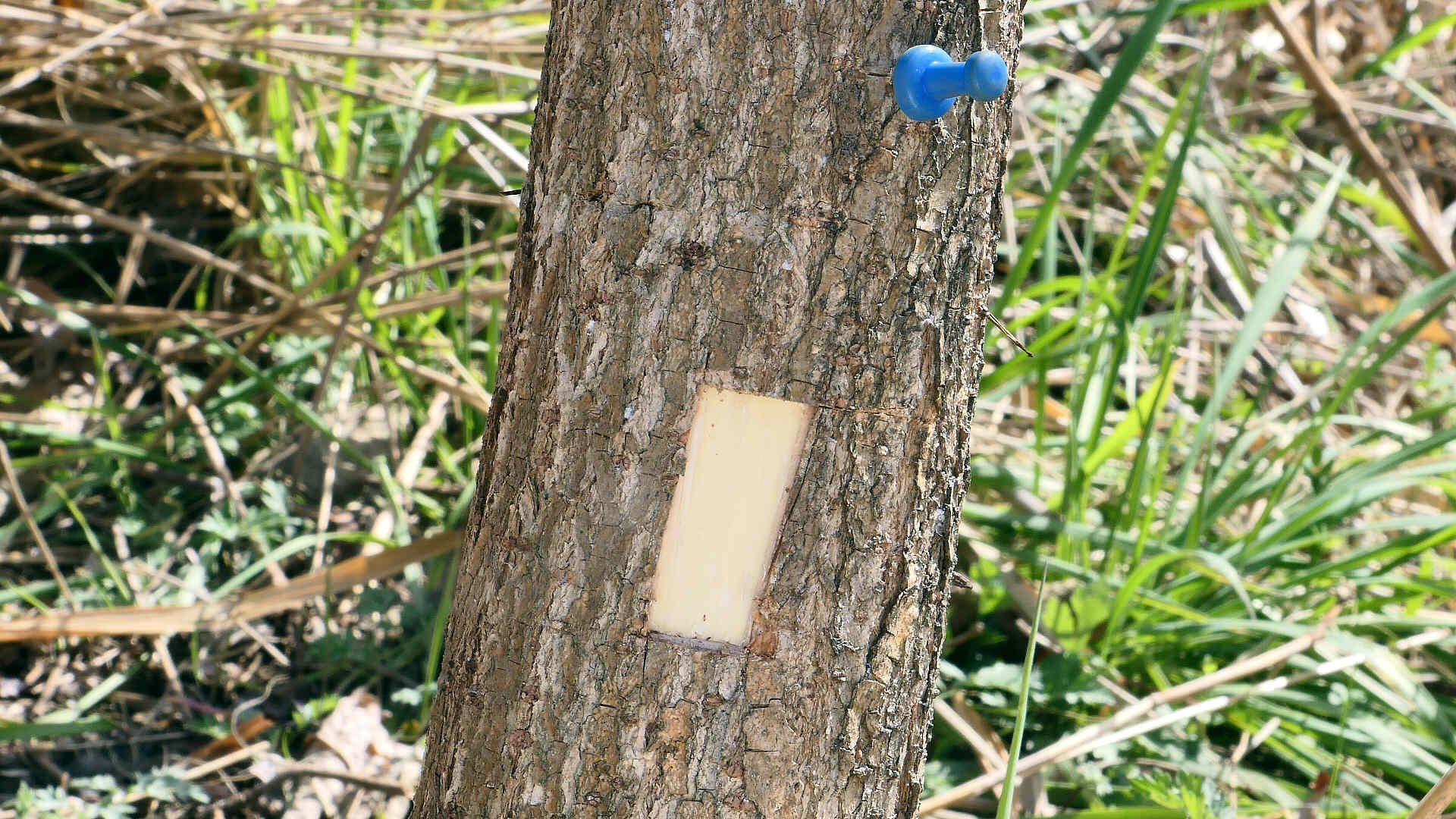 高田橋上流へ行く。樹幹から少し15cm程離れた地面に目印のピンが5〜6個まとまって転がっている。樹幹に刺していたピンはない。どうやら誰かがコムラサキ幼虫を見に来たようである。その誰かさんは今これを読んでるかも。そして、その誰かさんはピンがあると何かの邪魔なので、ピンを取り除いてそのまま去って行ったようである。観察中なのでピンは動かさずに居てもらいたい。