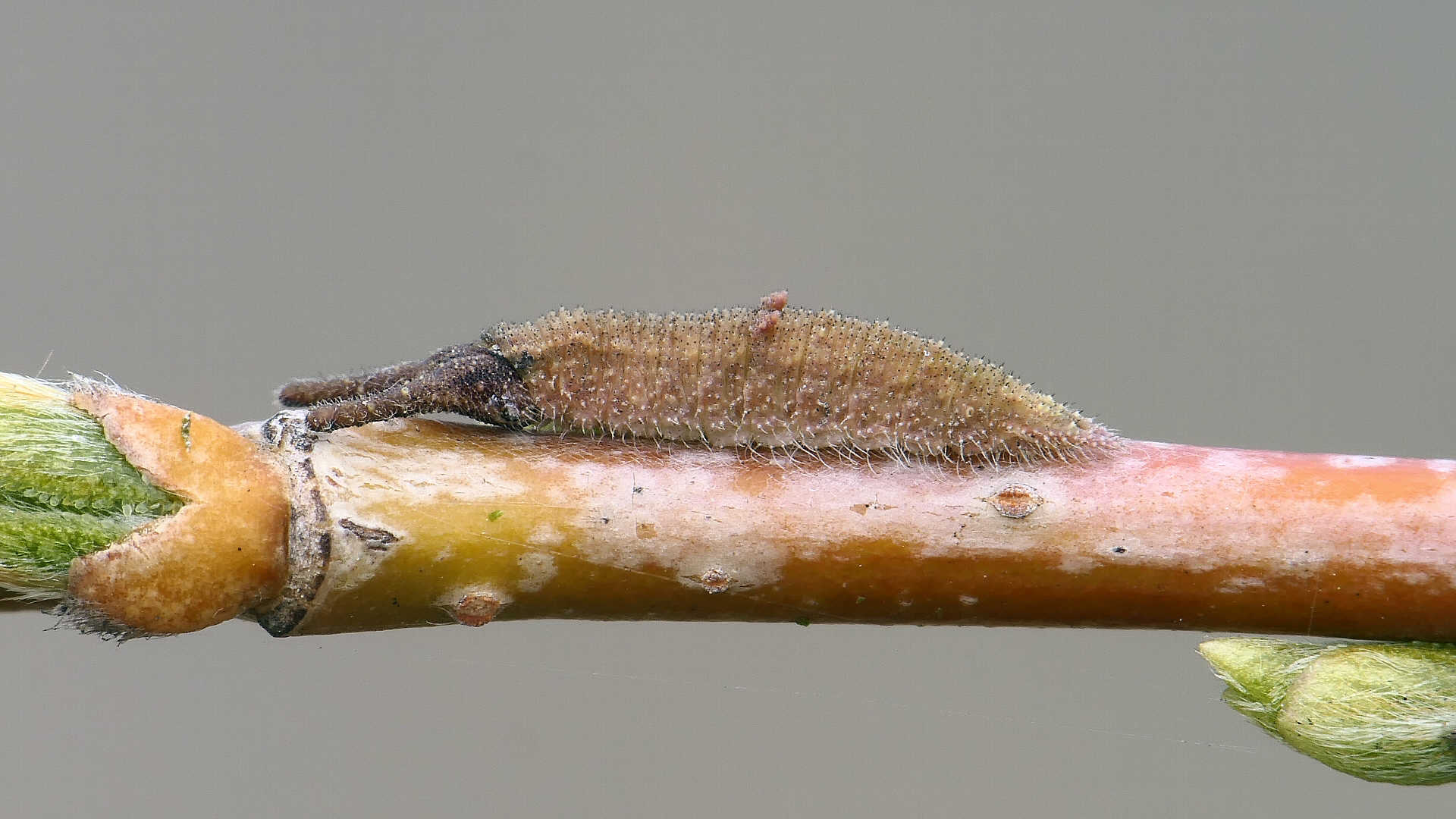 今日の一枚_02。コムラサキ、目覚めて間のない幼虫。自宅。