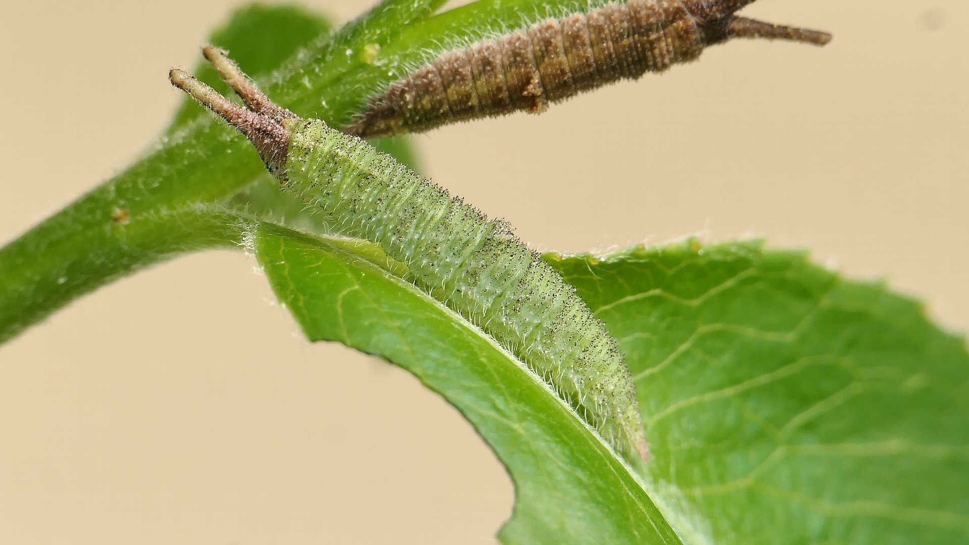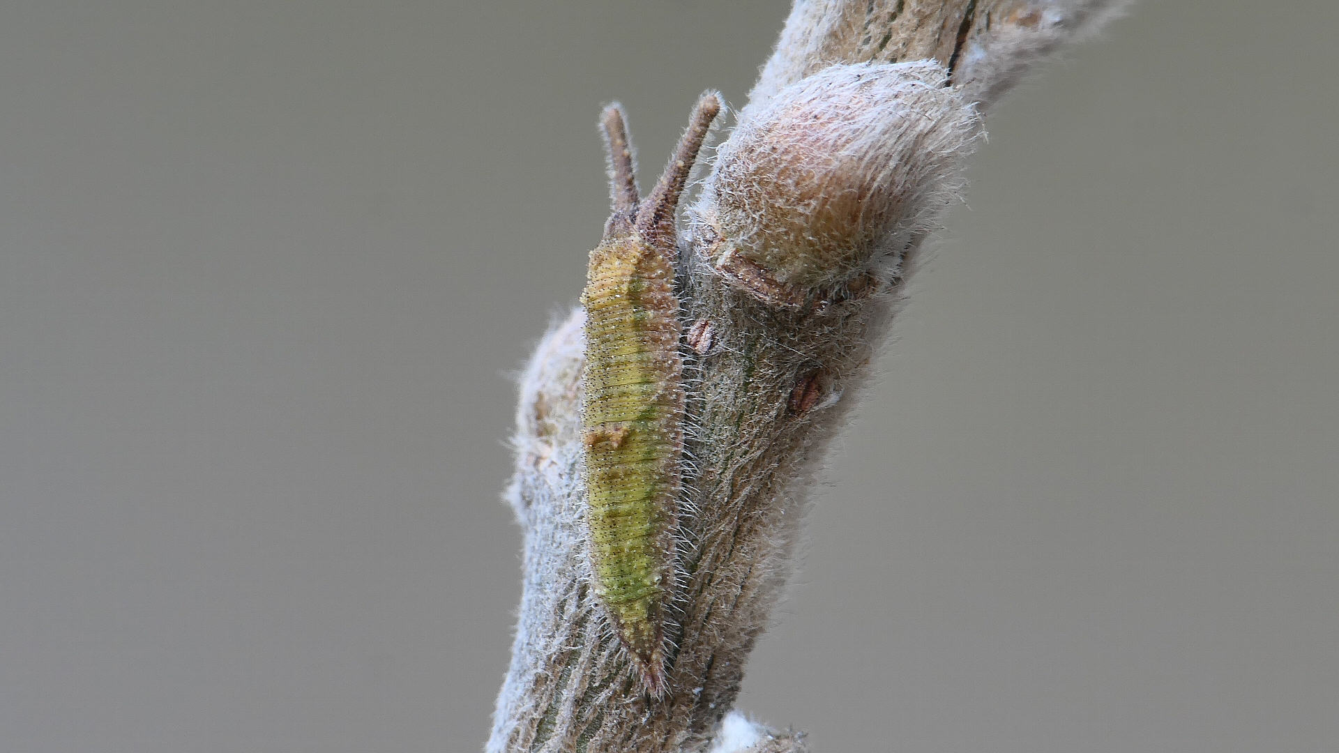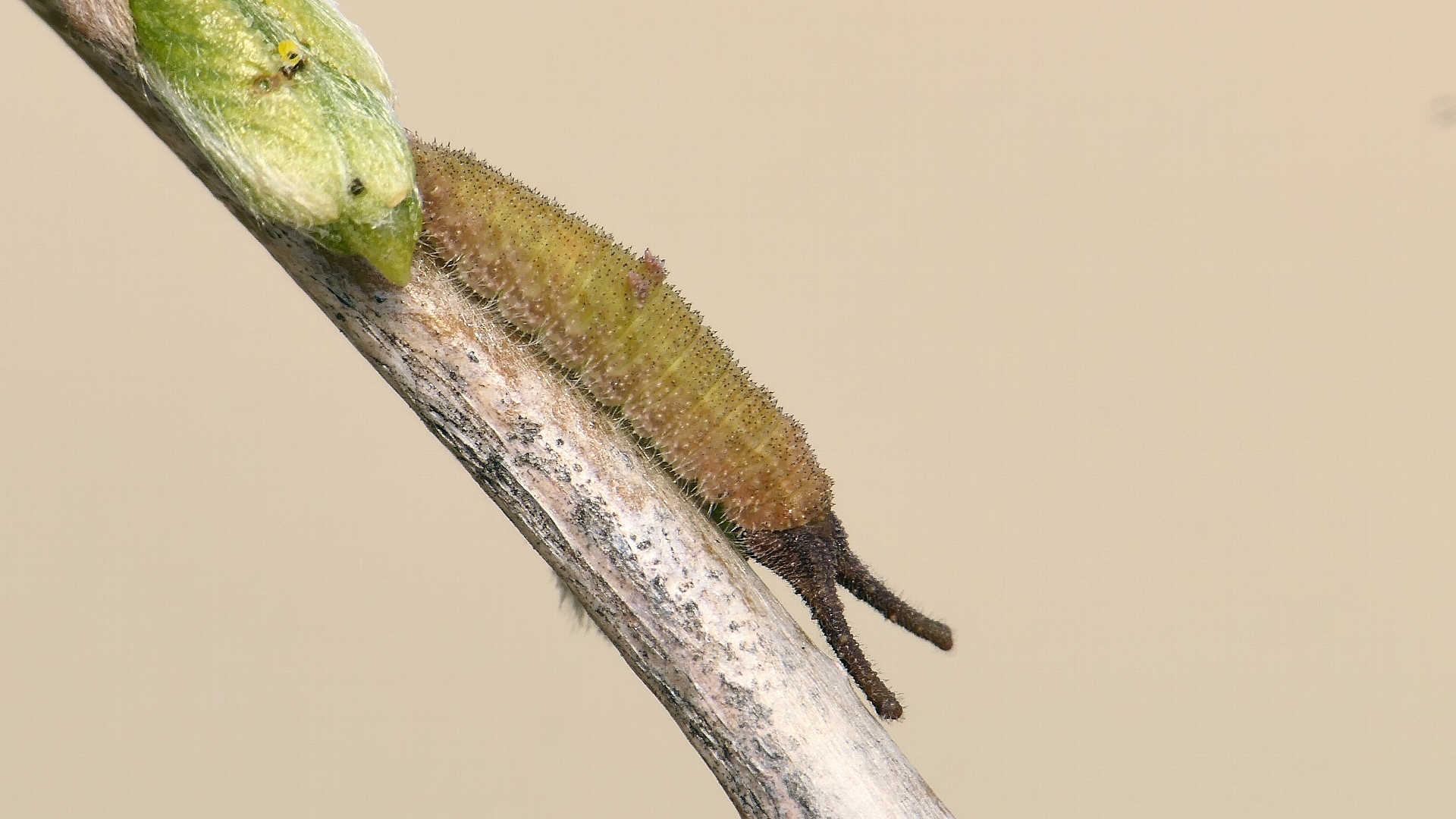 今日の一枚_05。コムラサキ、目覚めて間のない幼虫。自宅。