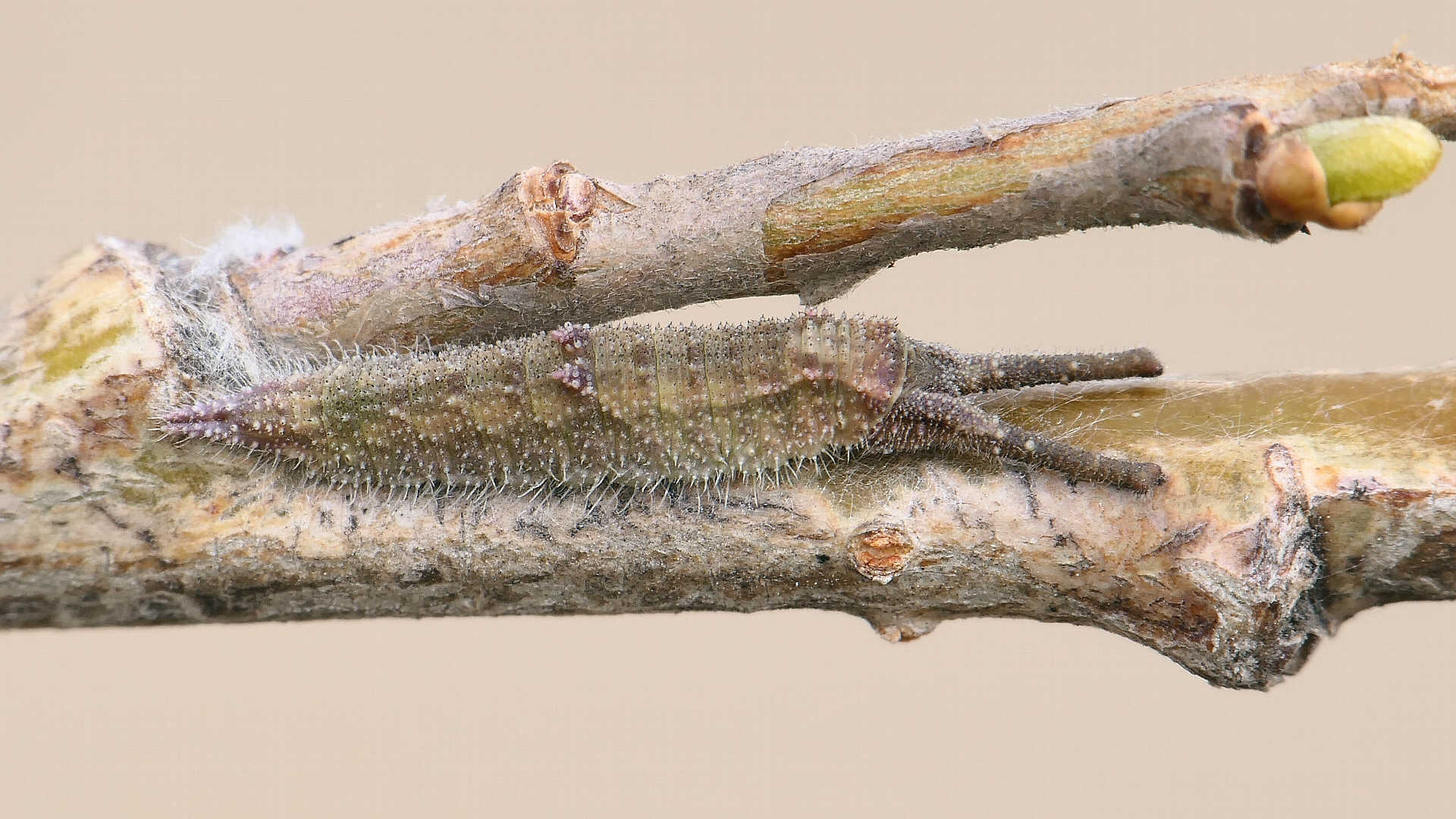 今日の一枚_09。コムラサキ、目覚めて間のない幼虫。高田橋上流。