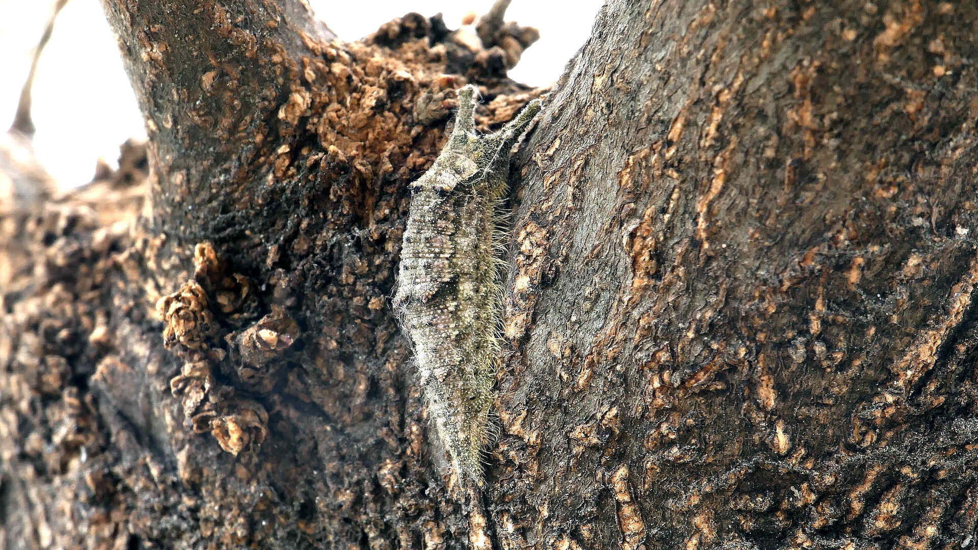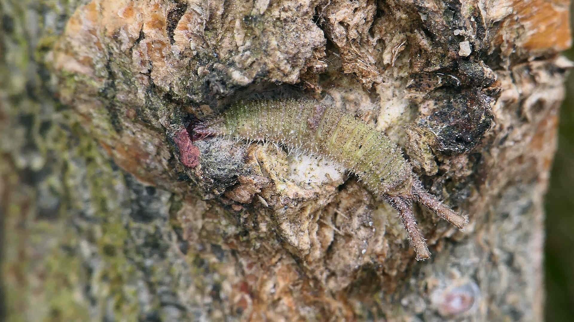 高田橋下流へ行く。え〜っ!樹幹に居たコムラサキ幼虫がとても少なくなっている。柳はまだ芽吹いていないのに、もう幼虫さん達は目覚めたのだろうか。2つほどまだ居たので撮る。