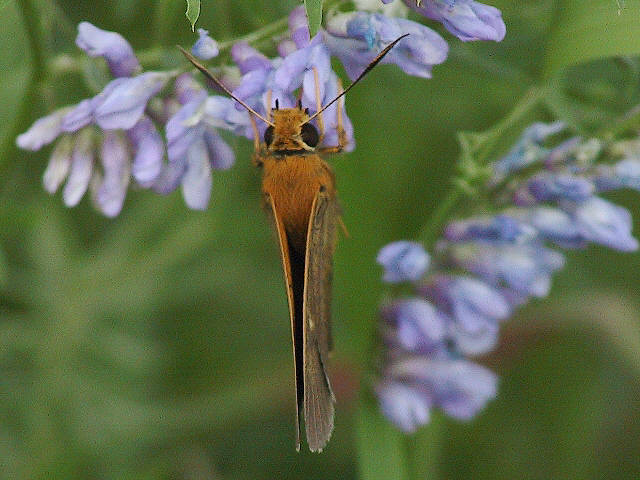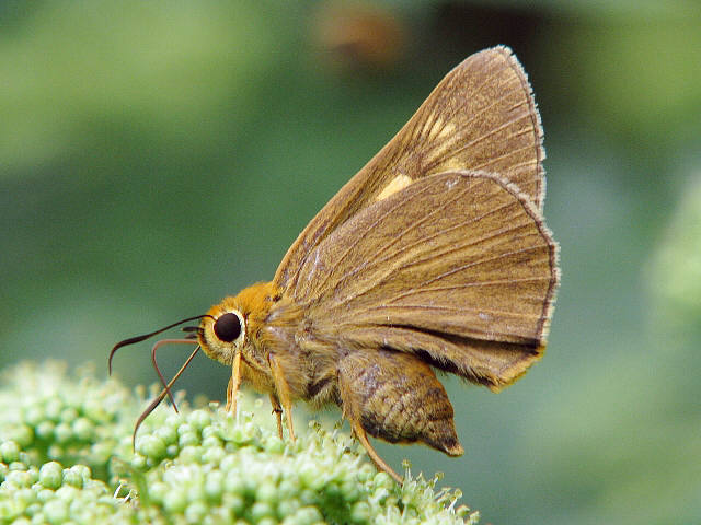 キバネセセリ 平成18年7月16日(日)。九重町、飯田高原。次を撮る間もなく飛んでいって、これ1枚きりです。次の幸運はいつ訪れることか・・・。古い文献「大分県の生物1981 日本生物教育大分大会記念誌(146-151 寺山武 九重山彙の蝶類)」には「希な種である」との記述があります。 平成19年8月4日(土)。飯田高原。少し色褪せています。♀と思います。