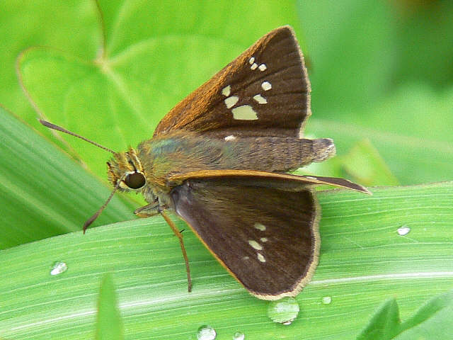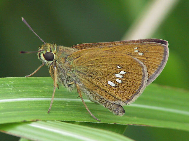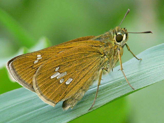 オオチャバネセセリ イチモンジセセリに似ていますが細長い白斑がずれて並んでいます。 平成17年7月27日(水)。♂。久住登山口、牧ノ戸峠。 平成17年7月27日(水)。♂。久住登山口、牧ノ戸峠。 平成22年6月28日(月)。♂。豊後大野市。 平成22年6月27日(日)。♀。豊後大野市。 平成16年6月12日(土)。♀。直入郡久住町。