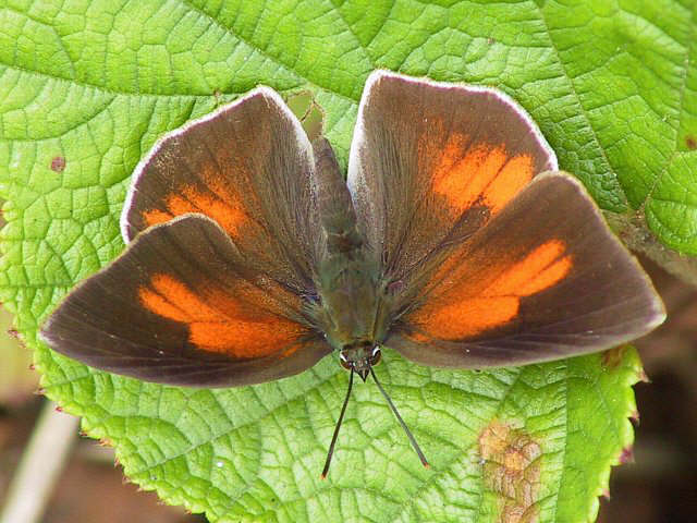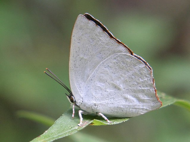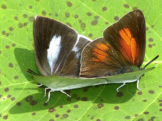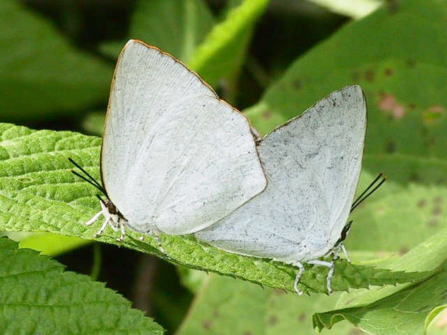 ウラギンシジミ 平成17年9月16日(金)。♂。翅を開いたときにわかりました。 平成17年6月7日(火)。♂はオレンジ色。 平成15年10月24日(金)。♀は白色。 平成15年6月1日(日)。左♀。 平成15年6月1日(日)。左♀、右♂。